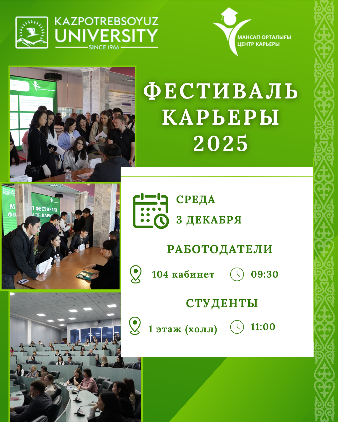«Выбираем работу вместе!» — такой был девиз Фестиваля карьеры, который прошел 3 декабря 2025 года в КарУ Казпотребсоюза. Студенты и выпускники получили уникальную возможность лично встретиться с потенциальными...