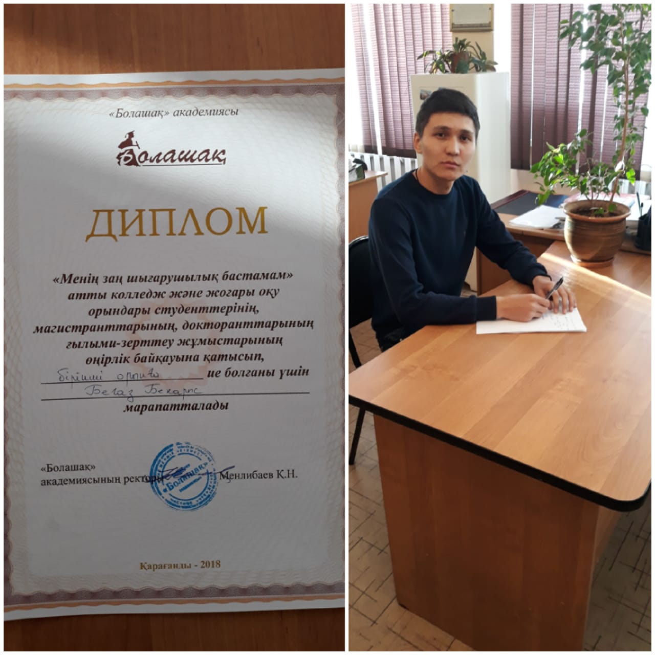 We congratulate the student of group Ю-31k Begaz Bekarys with the first place in the regional competition «My legislative initiative» among universities and colleges in Karaganda.