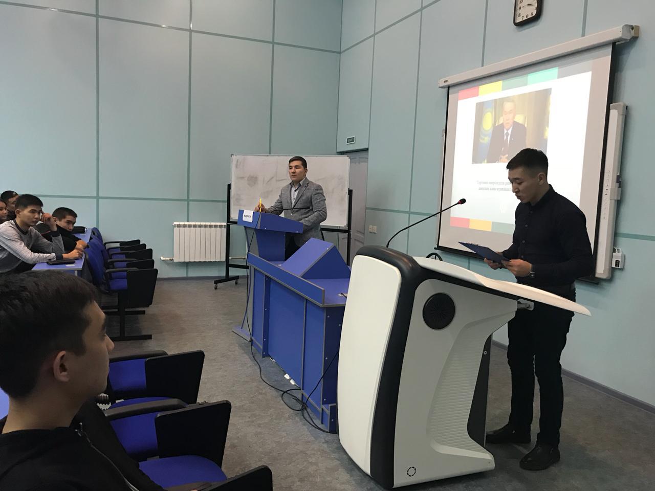 Message from President of Republic of Kazakhstan N. Nazarbayev to the people of Kazakhstan "Growth of welfare of Kazakhstan people: increase of income and quality of life" is actively studied in the educational process of our University. What are the trends in the development of the Republic of Kazakhstan and how can contribute to the prosperity of the country's youth, how to become a competitive specialist – these and other equally important issues are discussed in the student community and on curatorial hours. Thus, the 2nd year undergraduates of the specialty "Jurisprudence" Kinsfater Arthur and Fedoseeva Ekaterina on October 31, 2018 held an open curatorial hour, which was preceded by an essay contest in the directions of the Message of the President of Kazakhstan.