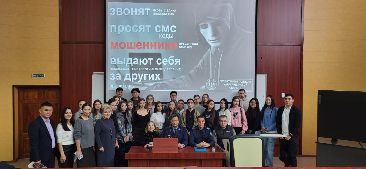 On November 14, a guest lecture on "Internet fraud" was held at the Karaganda University of Kazpotrebsoyuz with the participation of employees of the Police Department of the Karaganda region: A.A. Uskembayev - Head of the Criminal Police Department, Lieutenant Colonel of the Police; A.M. Kairakbayev - Head of the Department of Criminal Police, Lieutenant Colonel of the Police; A.B. Zhumanov - Senior Operational Commissioner of the Criminal Police Department, Police Captain; D. Rapishev - Operate Commissioner of the Criminal Police Department, Police Captain.