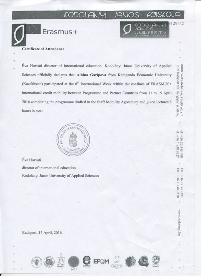 Lecturer of "Tourism and Catering" Garipova A. A. participated in the 6th international week and conference ERASMUS+international credit mobility from 11 to 15 April at the Kosolanyi Janos University of Applied Sciences, Budapest. The teacher teach lectures in English in number of 8 hours for students from Hungary and different countries, participating in academic mobility program ERASMUS. She took an active part in seminars.