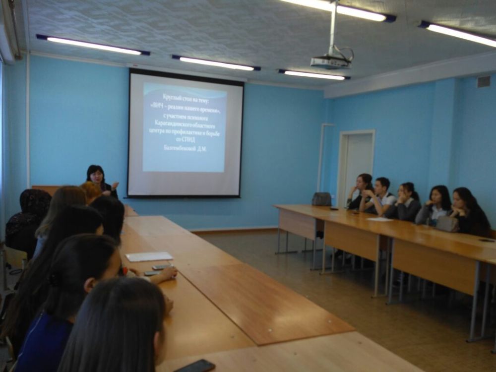 Within a framework of the World campaign to the fight against AIDS “I am for! HIV prevention” on the 27-nd of November teachers of the Higher mathematics department Aytenova M.S. and Kozlova N.G. held a round table on the theme “HIV is the realities of our time” with the participation of the specialist of the Karaganda center of the AIDS prevention and fight Balgembekova D.M. There were watched videos and discussed questions related to HIV prevention and ways of its transmission. Students took part in the discussion of questions about HIV transmission fight.