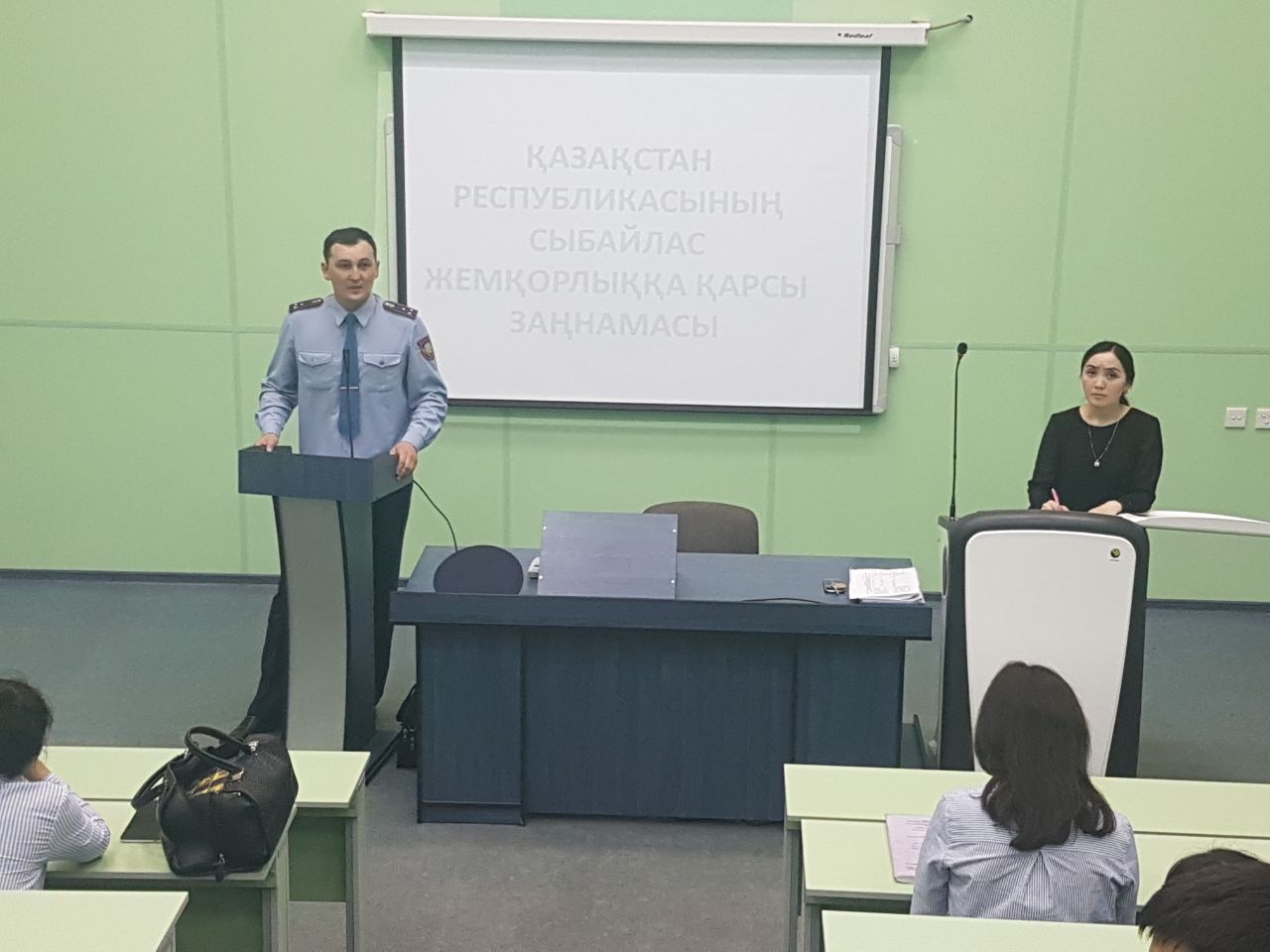 April 20, 2017 masters of the department of «Social Work and Socio-Political Disciplines» N.E. Tutinova and Makhanova B.R. organized a meeting of students with the Master of Law, senior lieutenant of the Karaganda Academy of the Ministry of Internal Affairs of the Republic of Kazakhstan named after B. Beysenov Tusupbekov Alibek Boranovich with a lecture on «Sociocultural and legal factors for preventing corruption». The meeting was held within the framework of events organized by the Department to explain the main provisions of the Address of the President of the Republic of Kazakhstan N.Nazarbayev to the people of Kazakhstan «The Third Modernization of Kazakhstan: Global Competitiveness». Students actively participated in the discussion, asked questions, expressed their views and suggestions on the topic under discussion.