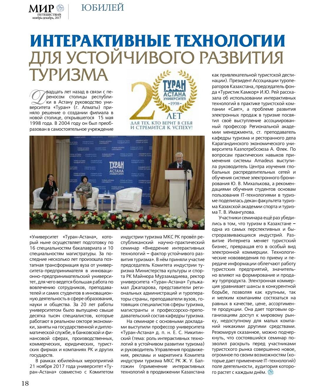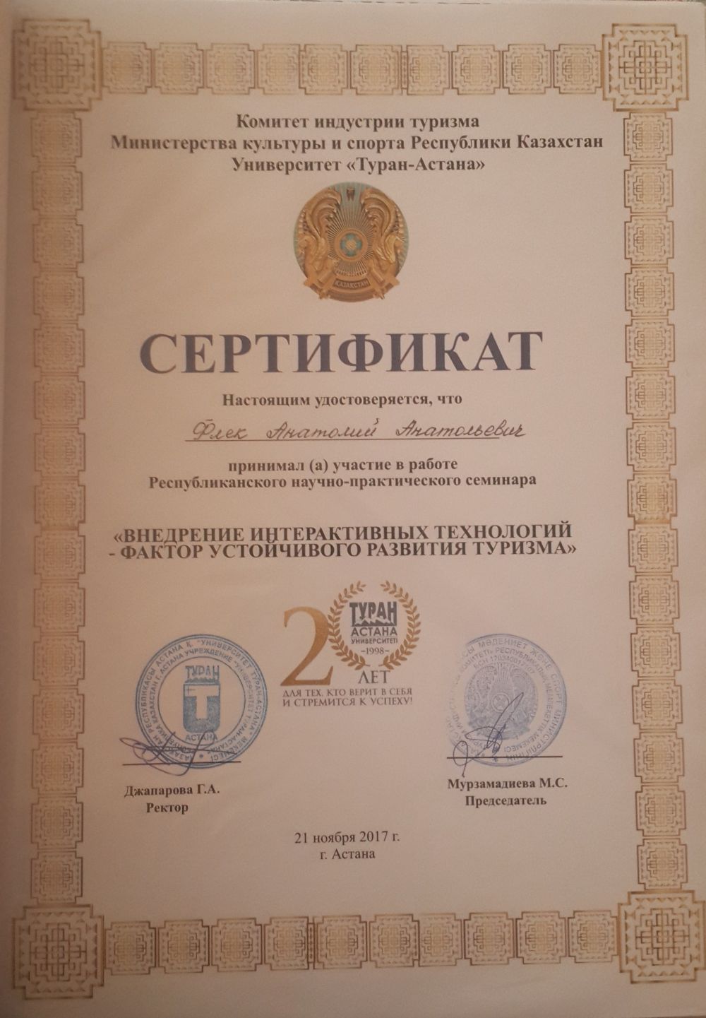 21 November 2017, the Senior lecturer of «Tourism and catering» chair Flek A.A. took part in the Republican scientific-practical seminar «Implementation of interactive technology — factor of sustainable tourism development» with the report «Main trends in development of e-sales in tourism» (certificate). The seminar was held at the University «Turan-Astana» (Astana).