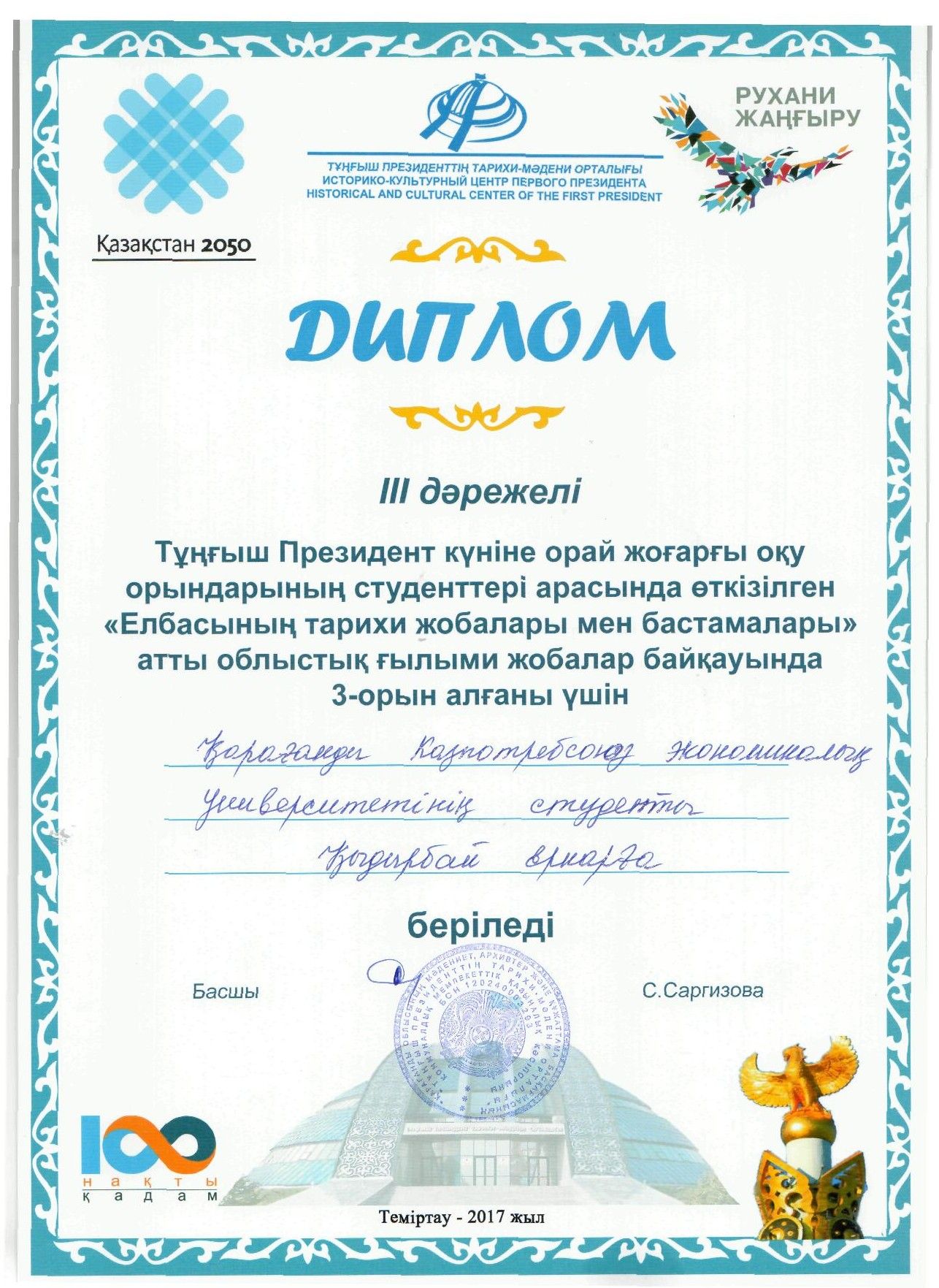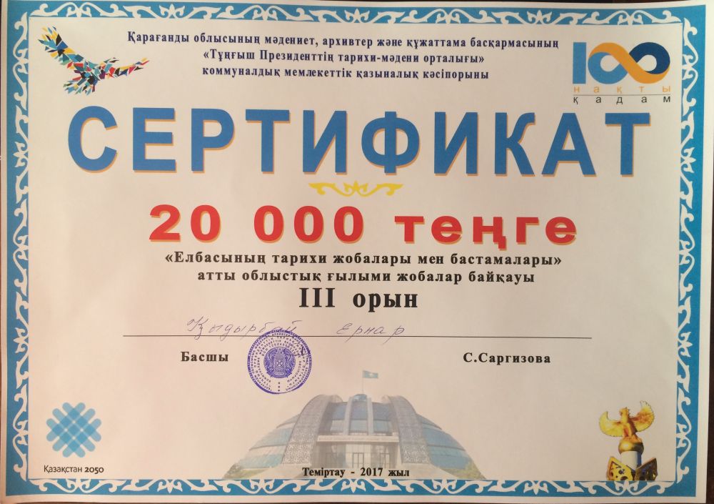 November 30, 2017 in the Historical and Cultural Center of the First President the regional contest of projects "Historical Projects and Initiatives of Elbasy" was held, dedicated to the Day of the First President of the Republic of Kazakhstan. The student of the group "GMU-42 to" Karaganda Economic University Kydyrbai Ernar Merekeuly participated with his scientific and innovative project "STOPJEMQOR" and took 3rd place, also our student became the owner of the certificate for 20 000 tenge.