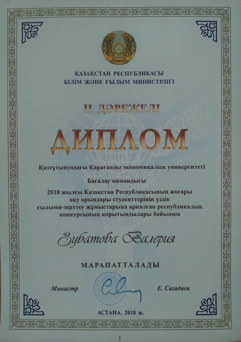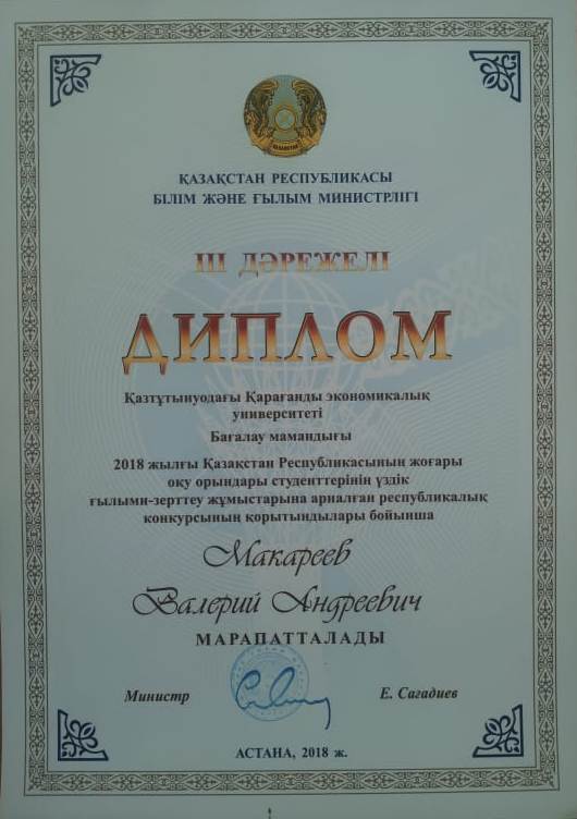 Congratulations to the students of the specialty "Assessment" Gubin Christina, Valery Zubatov with the occupied II-th place and Valery Makareev with the occupied III-th place in the annual national competition of research students in natural, technical, social, humanitarian and economic Sciences in higher educational institutions of Kazakhstan, conducted by the Kazakh agrotechnical University. S. Seifullin. Scientific head of the project associate Professor Craiova G.N.