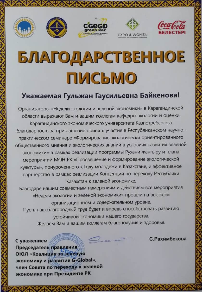 The Chairman of the Board, member of the Council for the transition to a green economy under the President of Kazakhstan S. Rakhimbekov, expressed gratitude to the head of the "Coalition for green economy and development G-Global". Department of "Ecology and assessment" and The Department of "Ecology and assessment" for the Republican scientific and practical seminar "Formation of environmentally oriented public opinion and environmental knowledge in the development of "green" economy" and effective partnership in the framework of the Concept of the transition of Kazakhstan to a green economy.