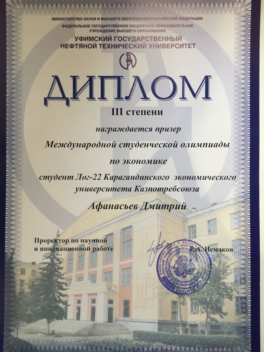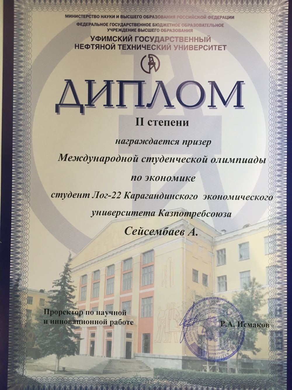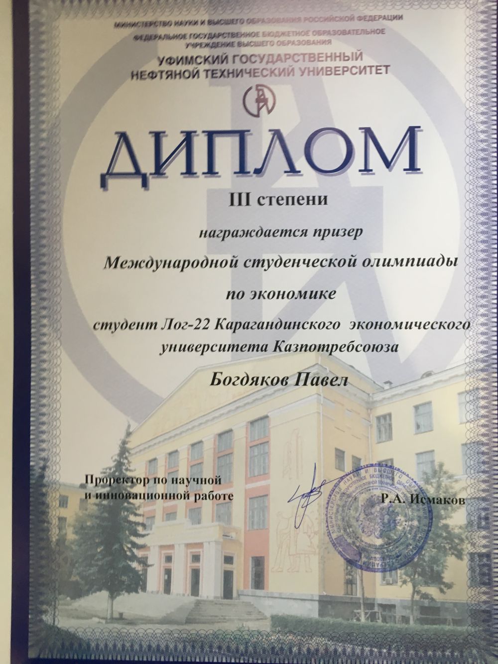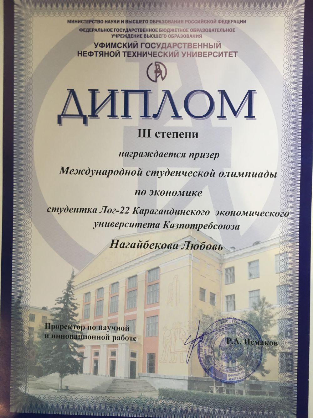 On April 25, 2019 students of Education program "Logistics" of the chair "Marketing and logistics" took part in the International Olympiad on Economics for students of 1-2 courses for non-economic specialties organized by Ufa state oil technical University together with Karaganda economic University of Kazpotrebsoyuz.