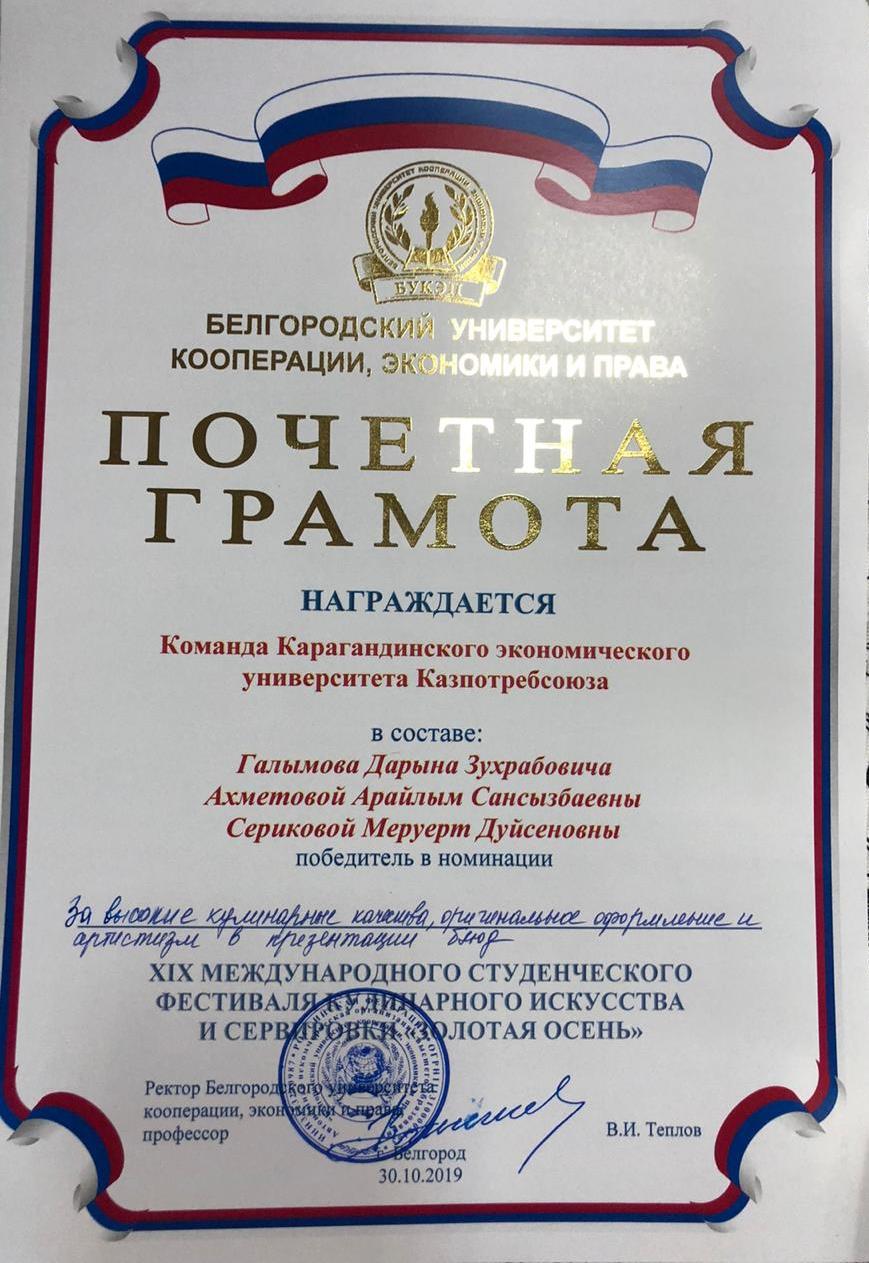 On October 30, 2019, students of the Department of merchandising and certification Galymov Daryn (TPP-19-3sk), Akhmetova Arailym (TPP-18-1K), Serikova Meruert (TPP-19-1K) won the competition at the XIX International student festival of culinary arts and serving "Golden autumn" in the category "for high culinary quality, original design and artistry in the presentation of dishes" (Belgorod University of cooperation, Economics and law, Belgorod, Russia). Congratulations to our winners!