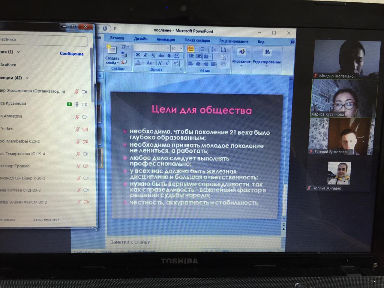 group Tour-18-1K Sakenova A., u-19-1K Ermek A. The priorities outlined in the Message are very important for the youth of our country. Students are very happy that first of all, the President focused on important issues of education and science for young people and instructed them to provide affordable and high-quality education.