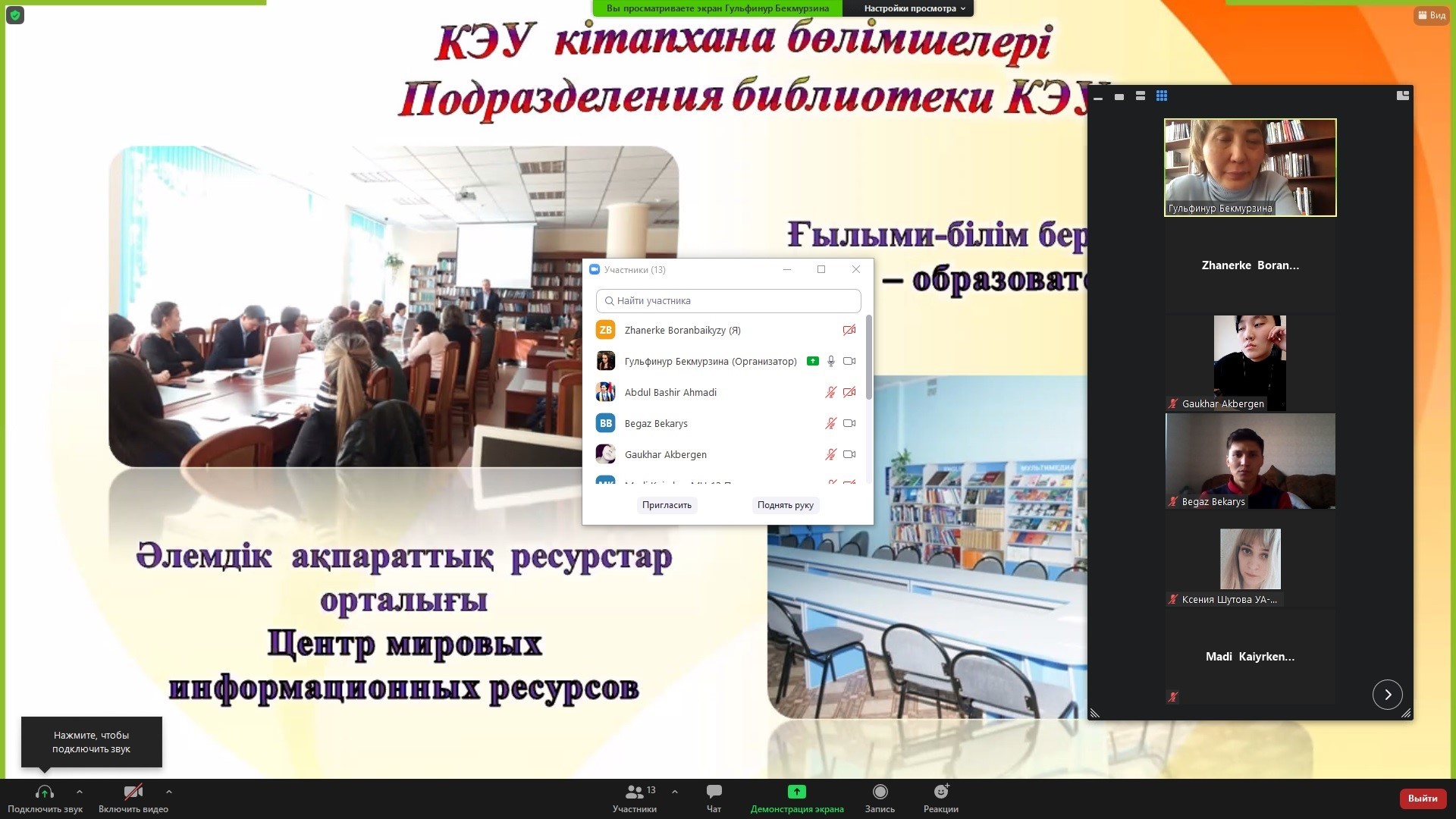 On the 28th of September, director of the library Satemirova K.K. was held an introductory lecture on working with the database of the KEUK library, issues on acquainting undergraduates with the world's library resources and their databases were highlighted. In this regard, in the context of coronavirus infection, each undergraduate has the opportunity to remotely use domestic and foreign literature.