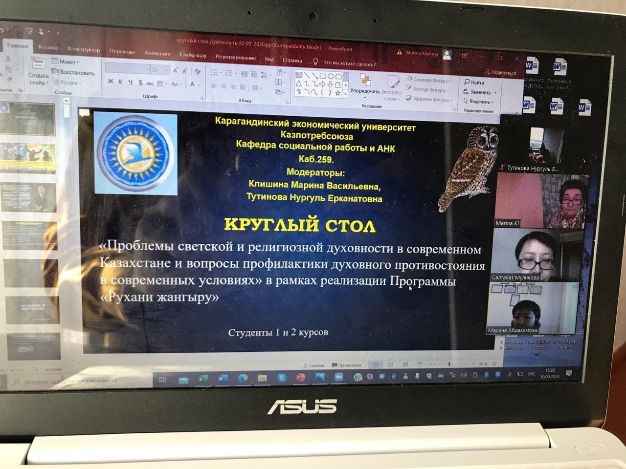 On September 30, KEUK hosted an online conference "Problems of secular and religious spirituality in modern Kazakhstan and questions of spiritual conflict prevention in modern conditions" as part of the implementation of the Rukhani Zhangyru Program, organized by the Department of SW and KPA, in which 1st and 2nd year KEUK students took an active participation. The conference was held within the framework of the Educational Program and the initiative theme "Philosophical analysis of the theory and practice of modern education." The reports were discussed that are significant both within the framework of research activities and within the framework of the formation of a worldview, a culture of thinking and the modernization of public consciousness of student youth: "KNOWLEDGE AND CREATIVITY" SHABUSOV D. Yu-19-4, "CREATIVITY AND CREATIVITY: SIMILARITY AND DIFFERENCES" MUSINA O. MO-19-2, "MENTALITY AS A BASIS FOR FORMING A RELIGIOUS MENTALITY" A. KOGTEV SPD-20-2, "PROBLEMS OF MODERNIZATION OF PUBLIC CONSCIOUSNESS" GERDA N. YU-19-4, "VALUE ORIENTATIONS VALUE VALUE ORDERAGE PROBLEMS OF PREVENTION OF SPIRITUAL CONFRONTATION IN THE MODERN WORLD "Zhumanova M. Yu-19-3," Formation of spiritual values in the family "Zhukenova L. Yu-19-3," Components of the value orientation 19-2 " SPIRITUALITY "BABICH YU. YU-19-3," RELIGIOUS SPIRITUALITY "BISLINGER MO-20-2," PROBLEMS OF SECRETAL AND RELIGIOUS SPIRITUALITY IN MODERN KAZAKHSTAN AND ISSUES OF PREVENTION OF SPIRITUAL CONFRONTATION IN " FRAMES "RUKHANI ZHANGYRU" T. ISKALIEV, R. Zhumataeva MO-20-2, "THE MEANING OF RELIGION IN A SECULAR COUNTRY" T. BALTASHEVA MO-19-1k.