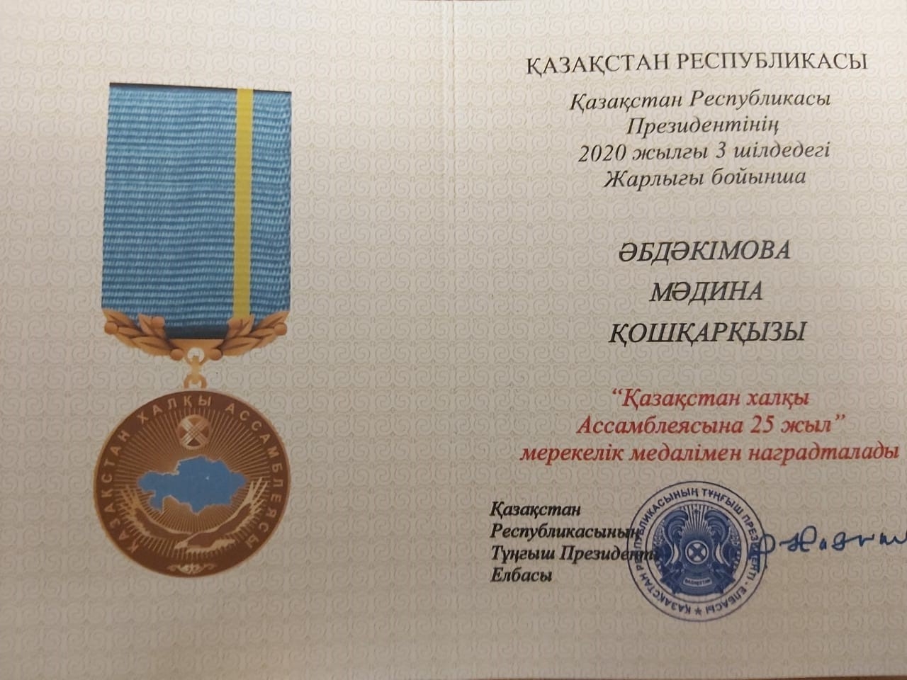 In July 2020, by the Decree of the President of the Republic of Kazakhstan Tokayev Kassym-Zhomart Kemelevich, the head of the department of SW and Assembly of the people of Kazakhstan KEUK, candidate of pedagogical sciences, associate professor Abdakimova Madina Kochkarovna was nominated for a medal in honor of the 25th anniversary of the Assembly of the People of Kazakhstan! The medal was awarded signed by the First President of the Republic of Kazakhstan – Elbasy N.A. Nazarbayev.