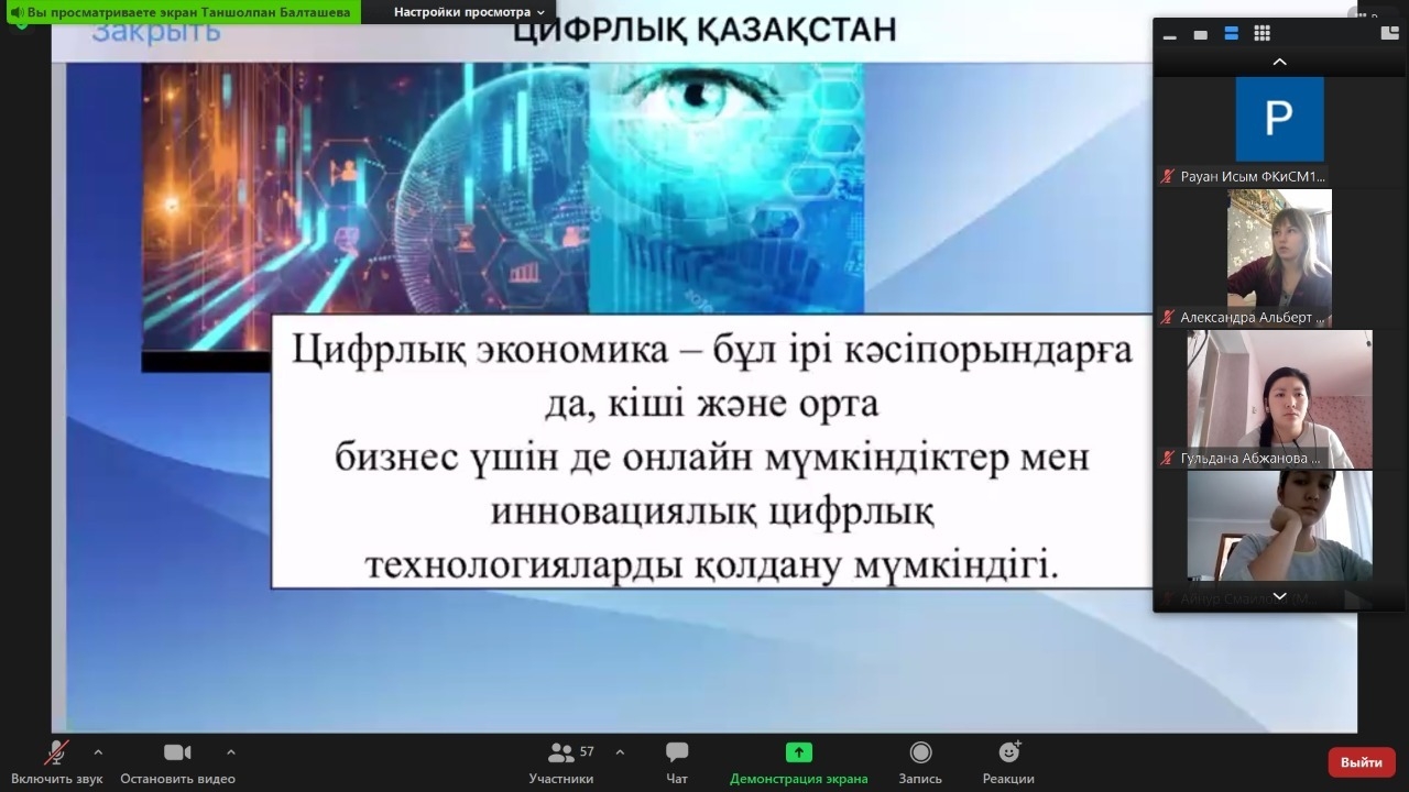 On November 16, 2020, the Department of Social Work and the Assembly of the People of Kazakhstan held a round table on the topic "Modern education in the context of digitalization." The digitalization trend was identified by the roundtable participants as a key development vector in almost all areas of activity. The problems and difficulties of the digitalization process in the educational sphere of Kazakhstan were voiced in the speeches of T. Baltashova, student of group MO-19-1k, Smailova A., students of group MO-19-2, Rozhkov K., student of group F-19-2, Pronina O., student of group TUR-19-2. Summing up the results of the work, the organizers of the round table are Candidate of Philosophy, Professor M.V. Klishina, Candidate of Philosophy, Associate Professor G.R. Seifullina, PhD, Senior Lecturer N.E. Tutinova noted that the digitalization trend is giving rise to a new paradigm of education based on an innovative technological platform, the demands of the labor market and society as a whole.
