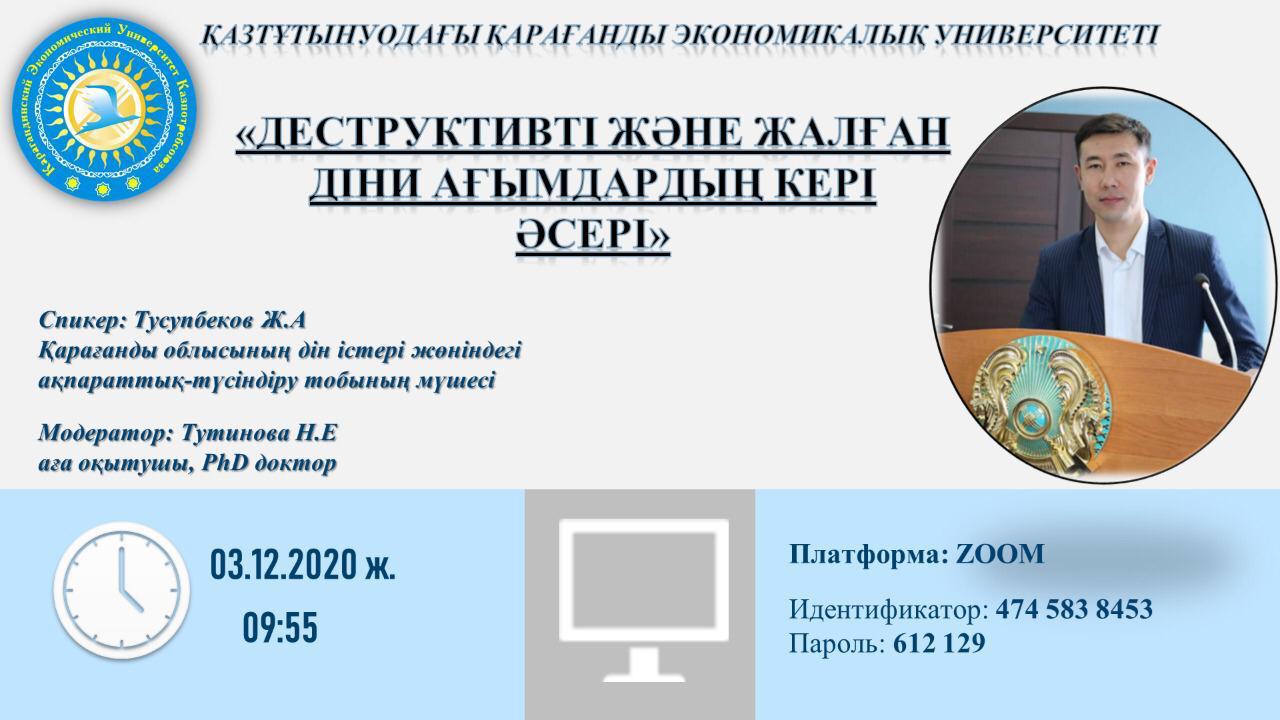 In 03.12.2020 Department of "Social Work and KPA" Faculty of Business, Law and Technology of KEUK, member of the information and explanatory group on religion of the Karaganda region Tusupbekov Zh. А. read a lecture on "The negative impact of destructive and false religious movements" for university students. During the lecture, the information and explanatory group announced the goals and objectives, provided information about non-traditional religious movements, as well as ongoing activities in the Republic of Kazakhstan and the Karaganda region. At the end of the lecture, the head of the Department of Social Work and ANC, Ph.D., Associate Professor Abdakimova M. K. told the students about the influence of non-traditional religious trends in modern society, and also thanked Zh. A. Tusupbekova for giving the lecture. At the end of the lecture students had the opportunity to ask questions of interest and received comprehensive answers. It was noticed that the lecture aroused interest and liked the students.