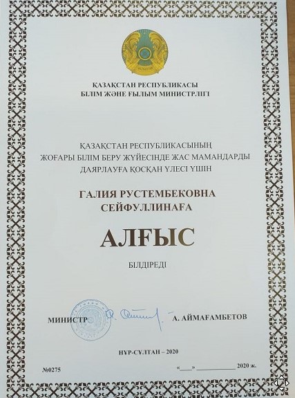 Associate professor of the Karaganda University of Kazpotrebsoyuz, faculty of "Business, law and technology", department of "Social work and ANC" Seifullina Galiya Rustembekovna in December 2020 by the Order of the Ministry of Education and Science of the Republic of Kazakhstan was awarded a letter of thanks "For the contribution training of young specialists in the system of higher education of the Republic of Kazakhstan "from the Minister of the Republic of Kazakhstan A.K. Aimagambetov. The staff of the department cordially congratulates Seifullina Galiya Rustembekovna and wishes her success in her future work !!!