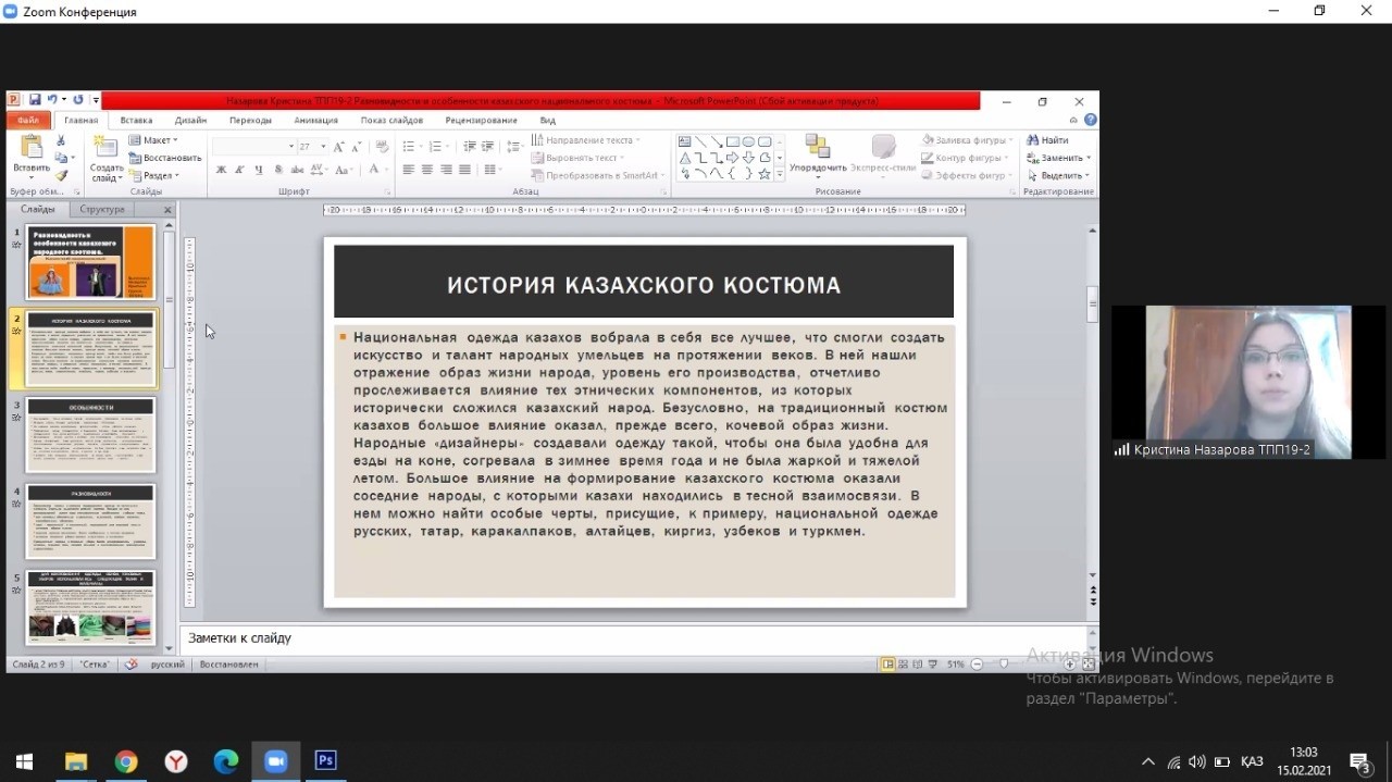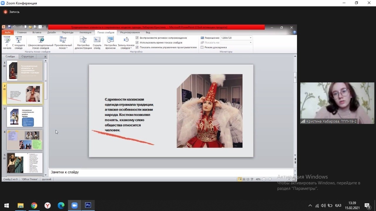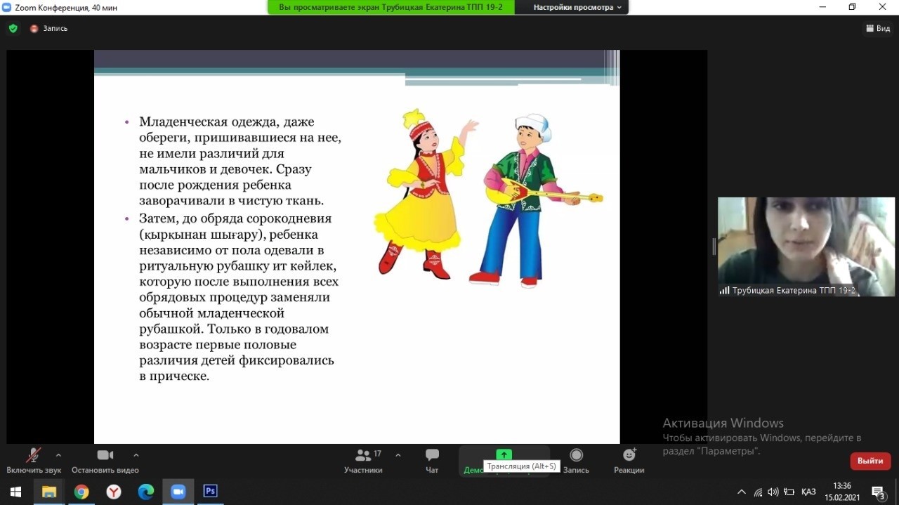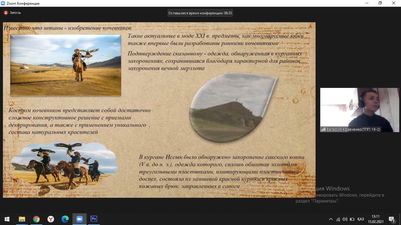 University students told about the varieties and features of the Kazakh national costume (K. Nazarova); military clothing and equipment of a nomad (V. Kravchenko); wedding dress, jewelry and accessories (Vaskovskaya K.,); women's, men's and children's headdresses (Kikimova D.B); children's national clothes (Trubitskaya E.); traditional elements in modern clothing (K. Khabarova).