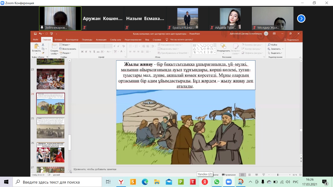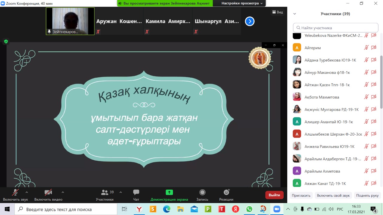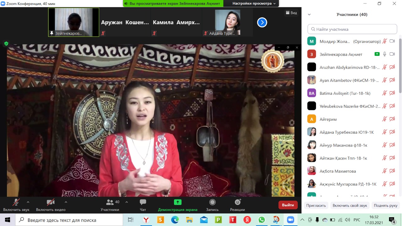On behalf of the President of the country, Kassym-Jomart Tokayev, within the framework of the draft concept of the celebration of Nauryz, March 17 was approved as the «Day of Honoring History». In this regard, the Faculty of business, law and technology together with the Karaganda Regional Museum of Local History held a lecture for students of the Karaganda University of Kazpotrebsoyuz on the topic «Traditions and customs of the Kazakh people». During the lecture, Akniet Zeynepkarova, a researcher at the museum, urged students to appreciate national values, instill a love for the country and the land, as well as to know history.