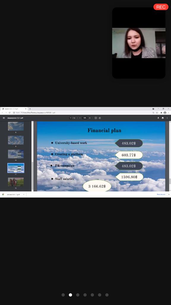 3rd place- "Development of an innovative method for producing tempered glass pellets using low-temperature plasma" developer Marta Androsova-2nd year student of the Faculty of Economics and Management, " Belgorod University of Cooperation, Economics and Law», «ФермероLog» - The developer Gisa Dana Meirlankyzy, a 4th-year student of the Faculty of Economics of Management and Entrepreneurship, Karaganda University of Kazpotrebsoyuz, Kino-cafe "Food and movie" in Karaganda region-developers Kim Elizaveta, Mazhitova Madina, Zhaksylykova Arai, Aina Ayrambaeva, Faculty of Business, Law and Technology, Karaganda University of Kazpotrebsoyuz
