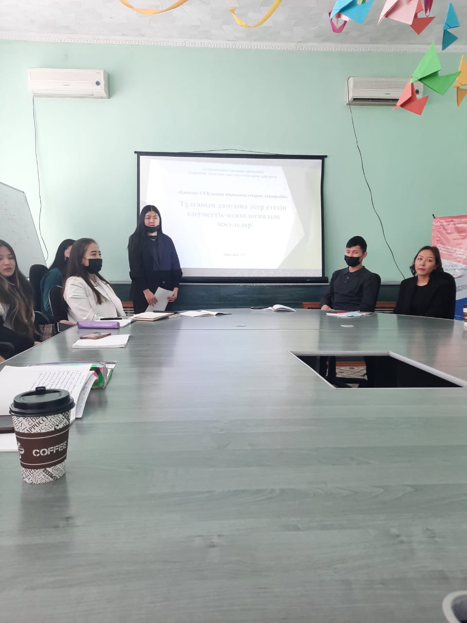 On February 14 of this year, a regular meeting of the student scientific community "Kamkor" of the Department of Psychology, Pedagogy and Social Work on the topic "Socio-psychological problems affecting the development of personality" was held at the coworking center. The meeting was attended by the head of the department, candidate of pedagogical sciences, associate professor M.K. Abdakimova, senior lecturer S. S. Isina, teacher A.A. Isaev, as well as students of the groups PiMO-21-1k, SR-20-1k, SR-20-1k. Students shared their research reports, in particular: