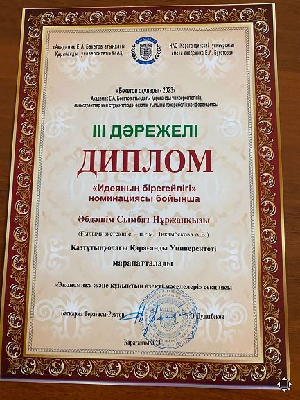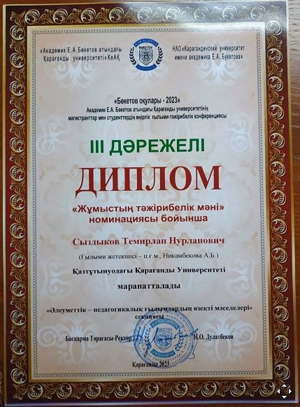 Our students were awarded diplomas of the III degree and diplomas of the Karaganda University named after Academician E.A. Buketov.