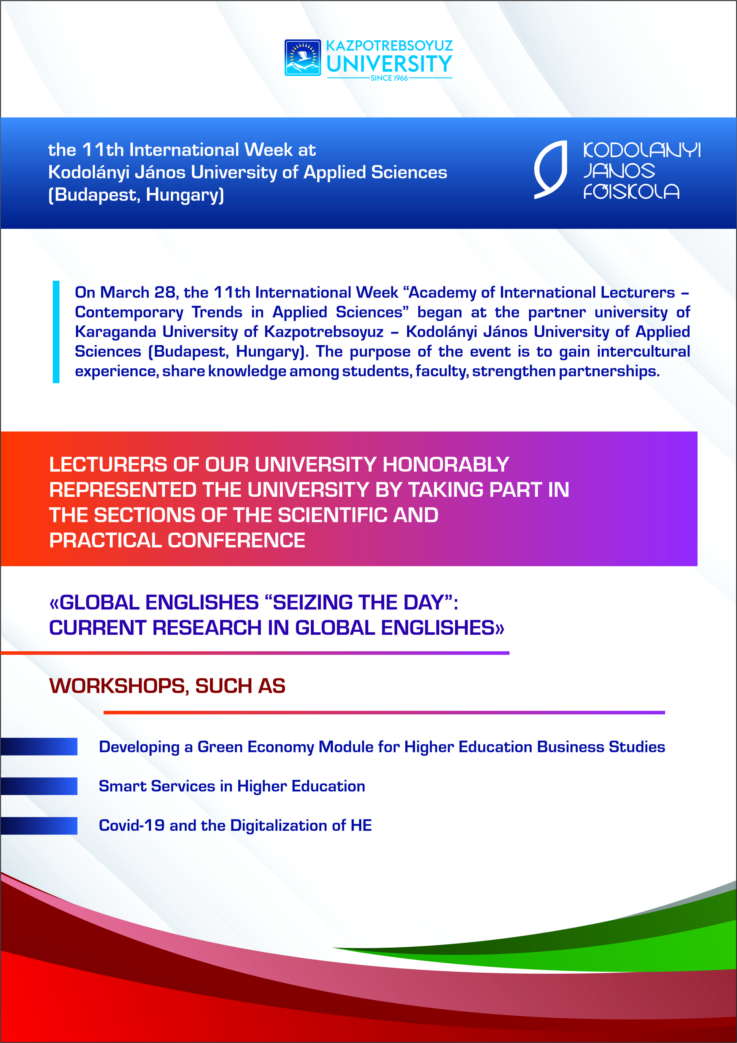 On March 28, the 11th International Week “Academy of International Lecturers – Contemporary Trends in Applied Sciences” began at the partner university of Karaganda University of Kazpotrebsoyuz – Kodolányi János University of Applied Sciences (Budapest, Hungary). The purpose of the event is to gain intercultural experience, share knowledge among students, faculty, strengthen partnerships.