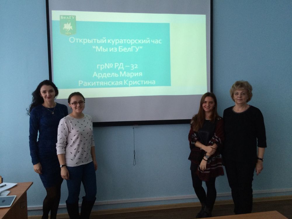 Кристина және Мария презентация дайындап, БелМУ туралы фильм көрсетті. Кураторлық сағатқа кафедра оқытушылары мен ХБЖО-ның директоры Е.В. Горячева шақырылды.