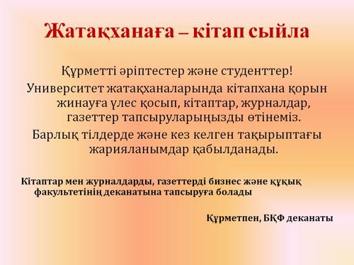2017-2018 оқу жылында кітапханада буккроссинг «Өзің оқып-өзгеге ұсын»атты кітап науқаны жүргізілуде,науқанға университет студенттері мен колледж студенттері сондай-ақ оқытушылар мен қызметкерлер белсенді қатысуда.Кітап айырбастау науқанының белсенді қатысушысы бол.