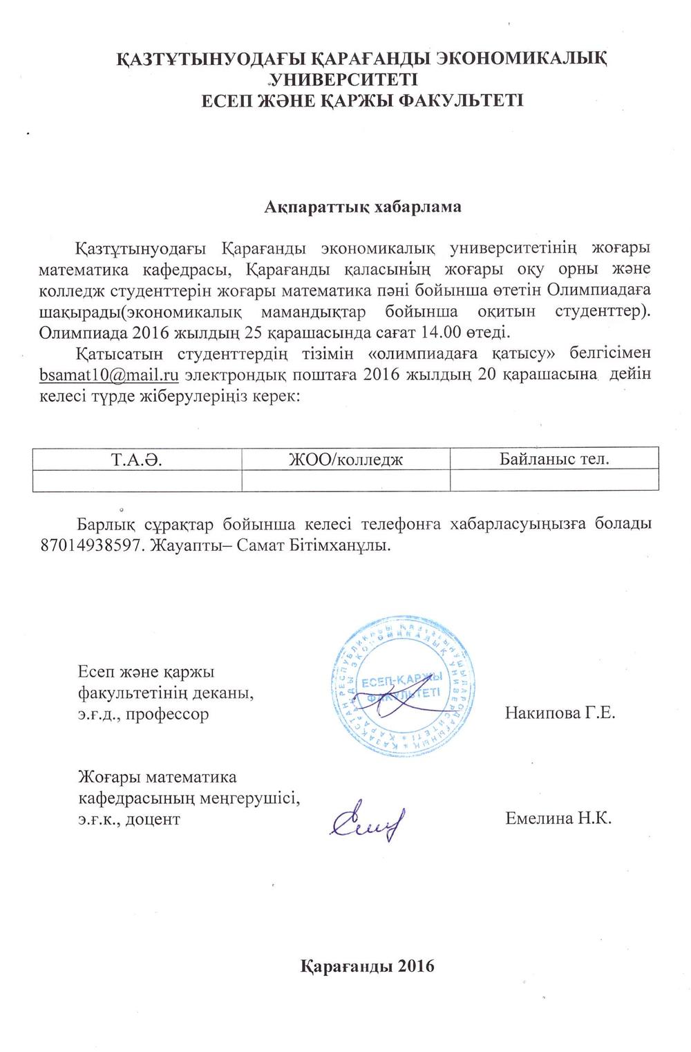 Қазтұтынуодағы Қарағанды экономикалық университетінің жоғары математика кафедрасы Қарағанды қаласының жоғары оқу орындары және колледждерде экономикалық мамандықтар бойынша оқитын студенттер арасында жоғары математика пәні бойынша Олимпиада өткізеді. Олимпиада 2016 жылдың 25 қарашасында сағат 14.00 өтеді.