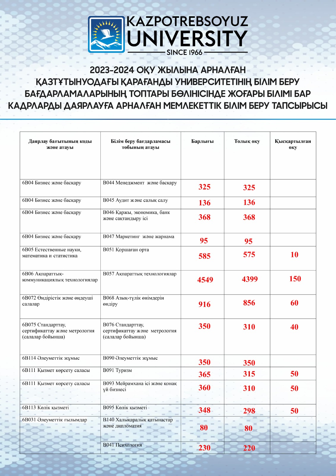 Биыл Қазтұтынуодағы Қарағанды университетін 43 жоғары және жоғары оқу орнынан кейінгі білім беру бағдарламалары бойынша 1607 адам бітірді. 81 түлек үздік диплом алады. Түлектеріміздің 72% жұмысқа орналастырылған, 7% магистратура мен докторантурада оқуын жалғастыруды жоспарлап отыр. 2023 жылғы 26 маусым 7 шілде аралығында Сіздер үшін факультеттердің дипломдарды салтанатты түрде тапсыруы ұйымдастырылады. - Студенттер сарайында (бакалавриат): Экономика, басқару және кәсіпкерлік факультеті-2023 жылғы 26 маусым сағат 15.00; Қаржы, логистика және цифрлық технологиялар факультеті – 2023 жылғы 27 маусым сағат 15.00; Бизнес, құқық және технологиялар факультеті – 2023 жылғы 29 маусым сағат 15.00; - мәжіліс залы (104 аудитория): магистратура-2023 жылғы 30 маусым сағат 11.00. Диплом алу үшін салтанатты іс-шараға қатысу мүмкін болмаған жағдайда, сіз ДАРВПО-ға (302 кеңсе) жүгінуіңіз керек. Жұмыс уақыты 9.00 - ден 18.00-ге дейін, түскі ас 13.00-ден 14.00-ге дейін. Демалыс: сенбі, жексенбі. Егер сіз дипломды жеке ала алмасаңыз, онда сіздің өкіліңіз диплом алу үшін нотариалды куәландырылған сенімхатпен ДАРВПО-ға (302-кеңсе) жүгіне алады. Баршаңызды салтанатты іс-шараларға қатысуға және біздің жаңа бейне қабырғамыздың жанында "Түлек-2023" тамаша естелік фотосуреттерін түсіруге шақырамыз!
