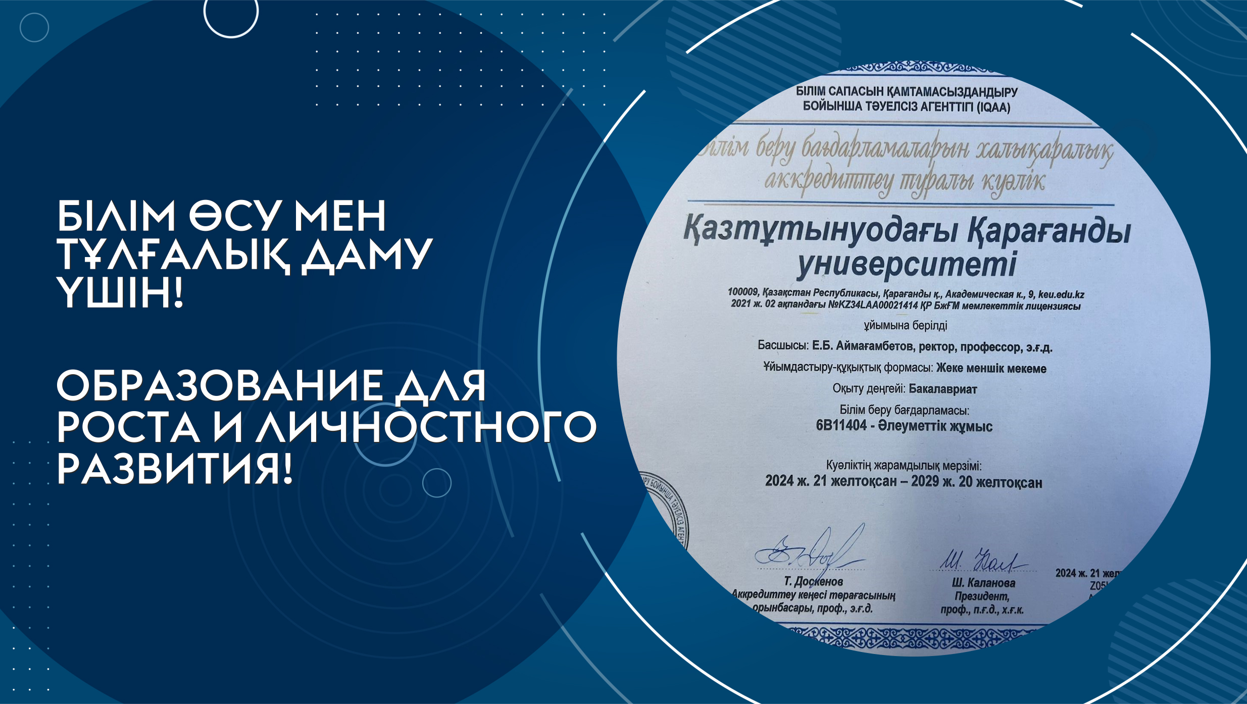 Қуана хабарлаймыз, біздің университетіміздің «Психология, педагогика және әлеуметтік жұмыс» кафедрасының «6В11404 - Әлеуметтік жұмыс» білім беру бағдарламасы арнайы бағдарламалық аккредитациядан сәтті өтті. Халықаралық аккредитация сертификатын беру туралы шешімді Білім сапасын қамтамасыздандыру жөніндегі Тәуелсіз агенттік қабылдады және ол келесі 5 оқу жылына дейін күшіне енеді. Бұл жетістік әлеуметтік жұмыс саласындағы мамандарды даярлау деңгейінің жоғары екенін және білім беру саласындағы халықаралық стандарттарға сай келетінін айқын растайды. Бағдарлама заманауи оқыту, инновациялық оқыту әдістері мен кәсіби біліктіліктерді дамытуға баса назар аударады, олар Қазақстанда да, шетелде де сұранысқа ие.