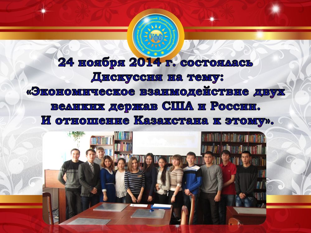 2014 жылдың 24 қарашасында «Екі ұлы держава АҚШ және Ресейдің экономикалық қарым-қатынастары»тақырыбына байланысты пікірталас өткізілді. Алғашқы сөз экономика магистрі, кафедраның аға оқытушысы Танашева Арайлым Бекболовнаға берілді. Баяндамашылар маңызды сұрақтарды көтеріп және оларды оптималды түрде шешу жолдарын қарастырды, сонымен бірге Қазақстанның бұл аядағы рөлін анықтады. Қатысушылар ретінде барлық курс студенттері болды. Өткізілген іс-шараның күәгері болғандарға үлкен рахмет!