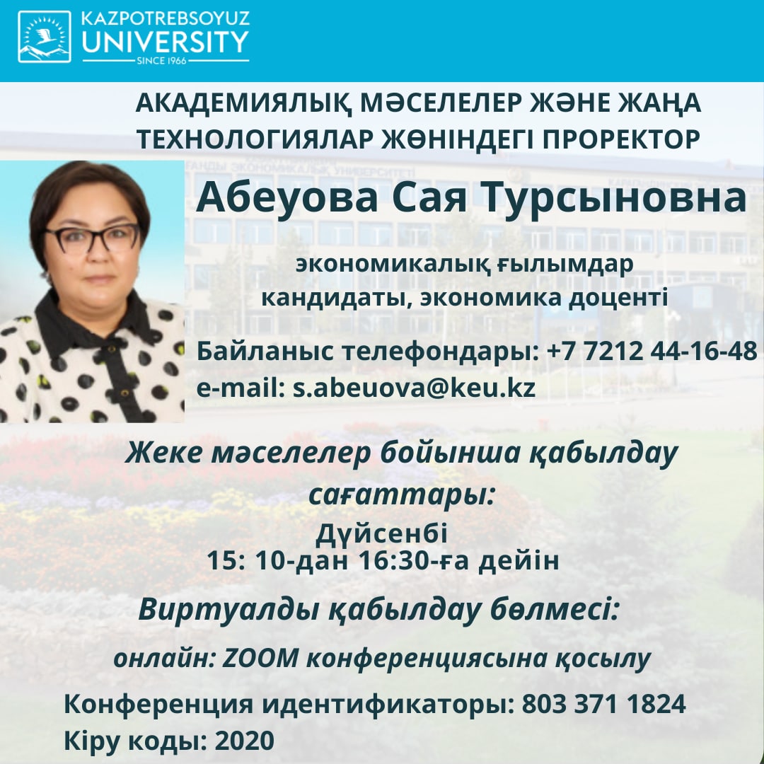 Егер сізде университет қызметіне қатысты мәселелер, сұрақтар немесе ұсыныстар болса, сіз академиялық мәселелер және стратегиялық даму жөніндегі проректор С. Т. Абеуоваға жүгіне аласыз.