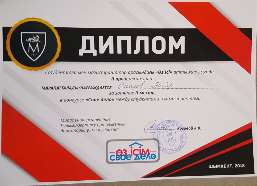 Оңтүстік Қазақстан облысының «Атамекен» кәсіпкерлер ұлттық палата атынан болған құзыретті қазылар алқасы, 15 жобалардың арасынан экономика және басқару факультетінің студенті Омаров Айбар 2-ші орынды ұсынды.