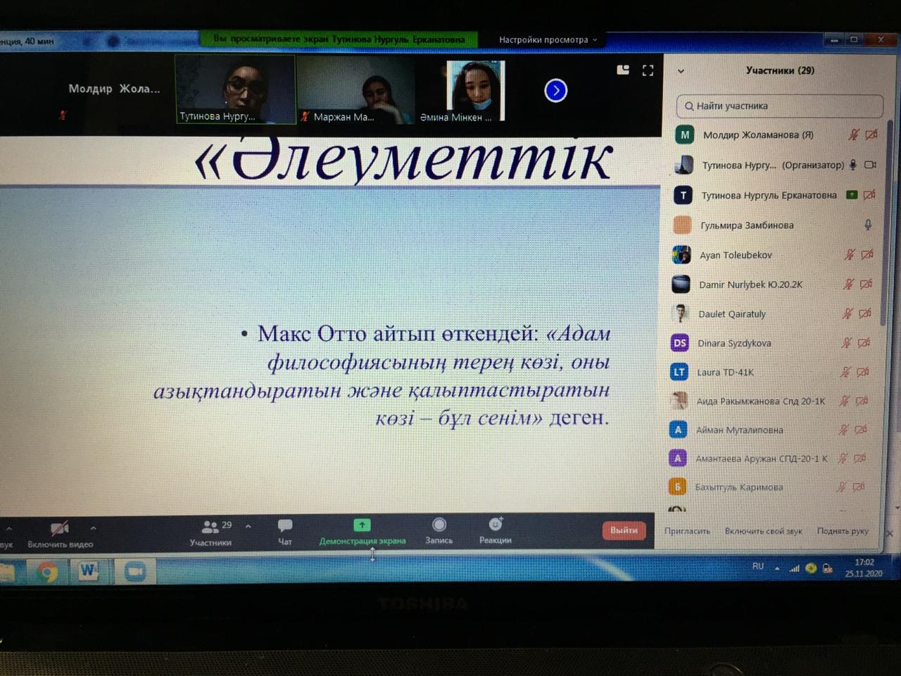 25.11.2020 жылы Қазтұтынуодағы Қарағанды экономикалық университетінде, Бизнес және құқық пен технология факультетінің, «Әлеуметтік жұмыс және ҚХА» кафедрасының ұйымдастырылуымен университет кураторлары және барлық студенттері үшін «Қазақстандағы қазіргі діни ахуал: дін мен мемлекеттің арақатынасы» атты тақырыбында аға оқытушы, PhD доктор Тутинова Н.Е өз дәрісін оқыды. Дәріс тындаушыларға қазіргі Қазақстан Республикасында дін мен мемлекеттің арақатынасы мен бүгінгі таңдағы ел ішінде жылдан-жылға көбейіп келе отырған діни мәселелер туралы алға тартылды. 2017 жылғы ресми тіркелген конфессиялар және оның атынан өкілдік ететін діни бірлестіктердің нақты сандық көрсеткіштері мен қазіргі таңдағы ҚР орын алған әлеуметтік-мәдени қақтығысты тудырып отырған дәстүрлі емес діни ағымдар, олармен күресудің жолдары туралы толық ақпарат берілді. Сонымен дәстүрлі емес діни ағымдардың тигізетін зардаптары, деструктивті мазмұны бар сайттарды сараптау мен мемлекет тарапынан жүргізіліп отырған жұмыстар туралы кеңінен айтылды. Дәріс соңында студенттер өздерінің сұрақтарын қойып, жауаптарын алуға мүмкіндіктері болды.