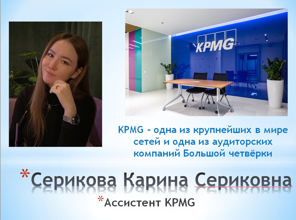 - Серикова Карина Сериковна – магистратура түлегі. KPMG көмекшісі - әлемдегі ең ірі кәсіби қызмет көрсету желілері және «Үлкен төрттік» аудиторлық фирмалардың бірі;