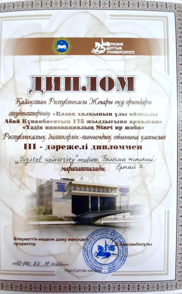 Байқауға 47 команда қатысты. Байқау қорытындысы бойынша ҚЭУ студенттері Жеңіс Асылтас Рамазанқызы, Кәкіш Шахризада Ертайқызы (ГМУ-18-1к), Абдрахманова Айзада Канатқызы (ГМУ-19-1к, ғылыми жетекшісі Ертай х.) start –up жобасы 3 орынға ие болды. Олар "DIGITAL UNIVERSITY" мобильді қосымшасының прототипін жасады.