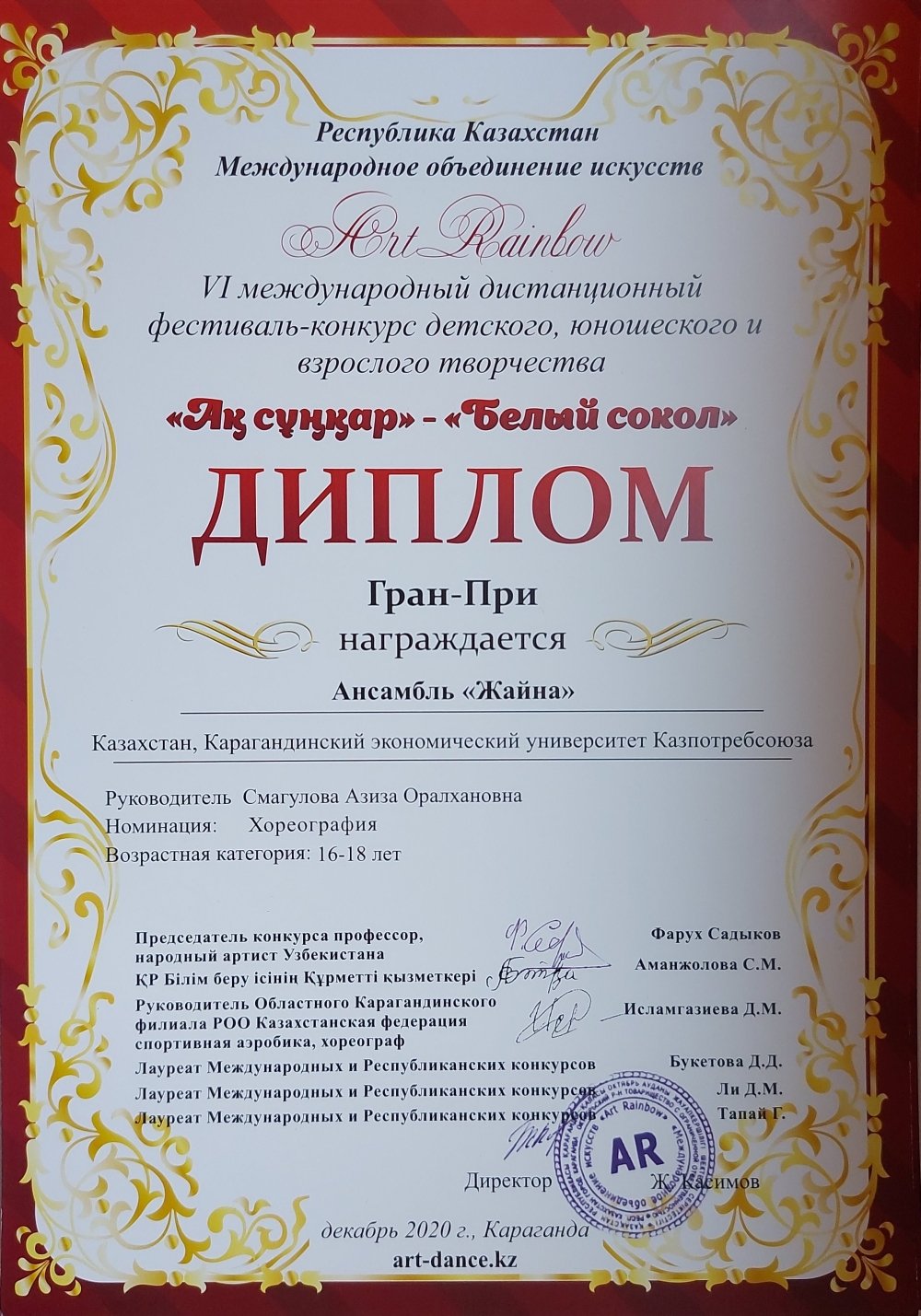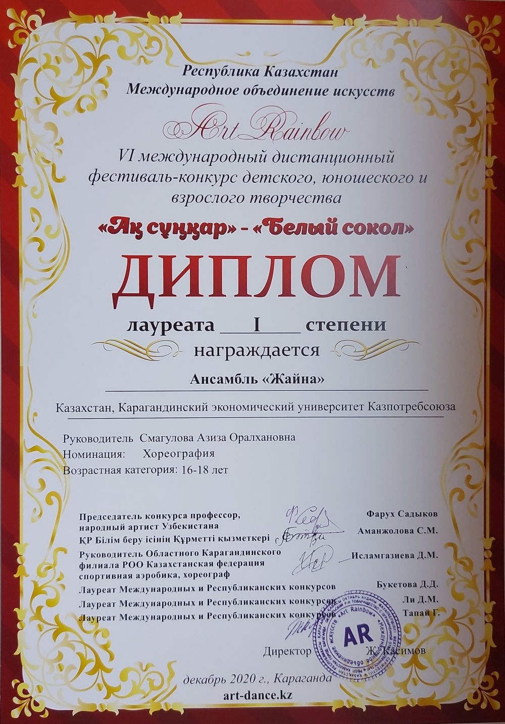 "Жайна" хореографиялық ансамблі "Ақ сұңқар"-"Белый сокол" балалар, жасөспірімдер және ересектер шығармашылығының VI Халықаралық қашықтық фестиваль - конкурсында жеңіске жетті (Қарағанды қ.)!