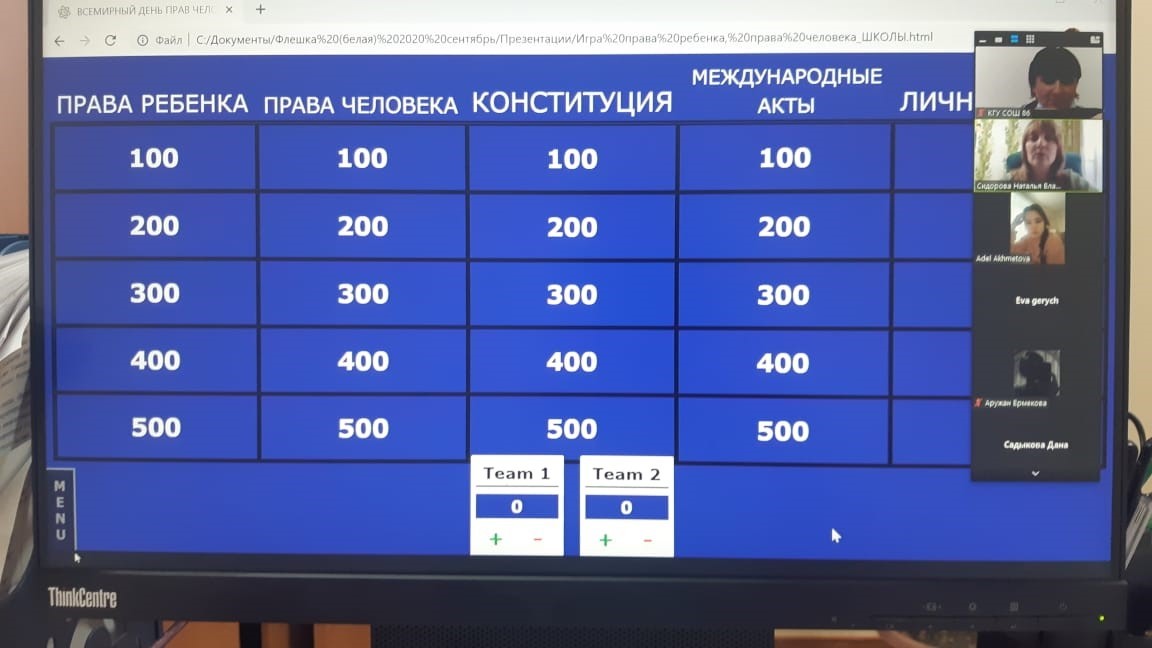 Викторина ZOOM платформасында «Своя игра» ойыны түрінде өтті. Ойын барысында бала құқығы, адам құқығы, адамның жеке құқықтары мен бостандықтары, адам құқықтары мен бостандықтарының Конституциялық бекітілуі, адам құқықтарының халықаралық стандарттары сияқты тақырыптар қозғалды.