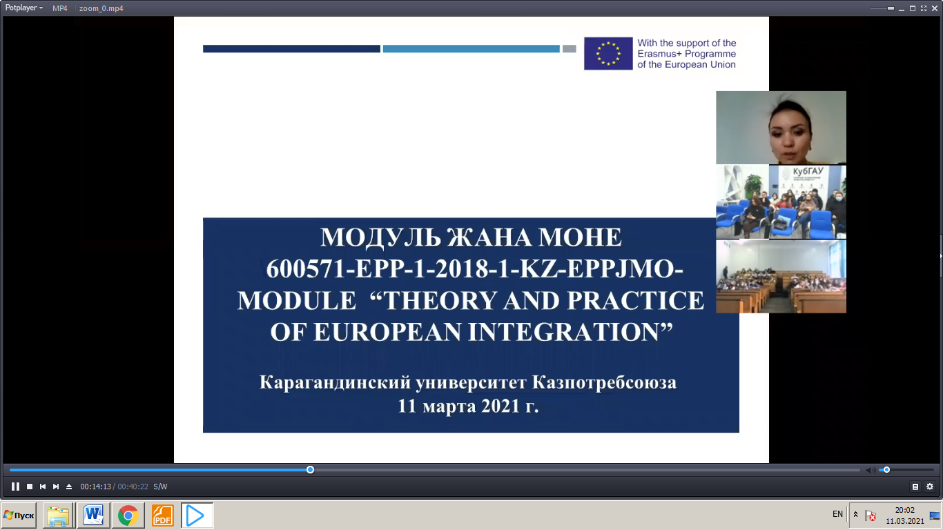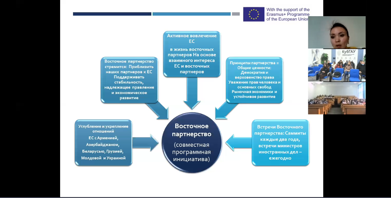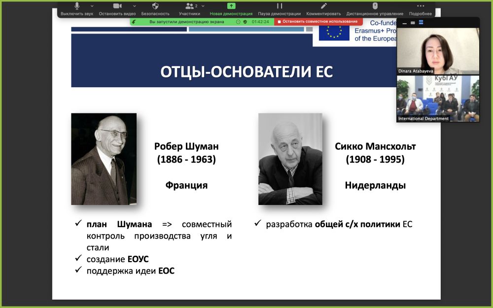 2021 жылдың 11 және 17 наурызында Халықаралық бағдарламалар мен жобалар және академиялық ұтқырлық орталығының көмегімен Эразмус+ Жан Моне 600571-EPP-1-2018-1-KZ-EPPJMO-MODULE “Theory and Practice of European Integration” жобасының нәтижелерін іске асыру үшін серіктес университеттер арасында ақпарат таратуда жобаға қатысушылары, Әлемдік экономика және халықаралық қатынастар кафедрасының аға оқытушылары Шукушева Е.В. мен Атабаева Д.Т. Кубан мемлекеттік аграрлық университетінің экономикалық және заңгерлік мамандықтарының студенттеріне арналған (Ресей) дәрістер оқыды. Дәрістер еуропалық интеграция теориясына, оның тарихына, сондай-ақ Еуроодақтың еуразиялық интеграция жағдайындағы посткеңестік елдерге қатысты саясатына және ЕО-ЕАЭО ынтымақтастығының перспективалы бағыттарына арналды.