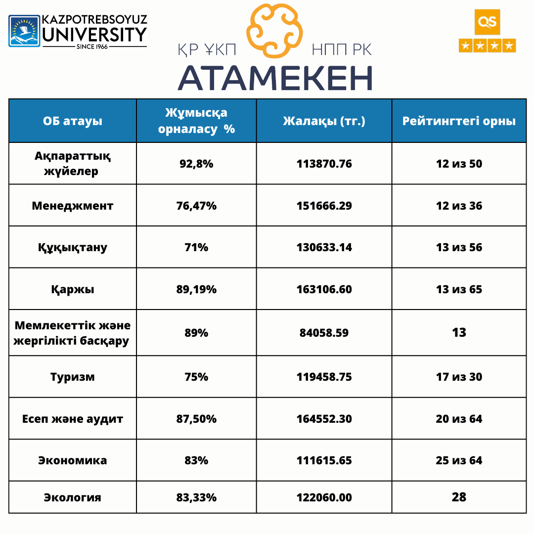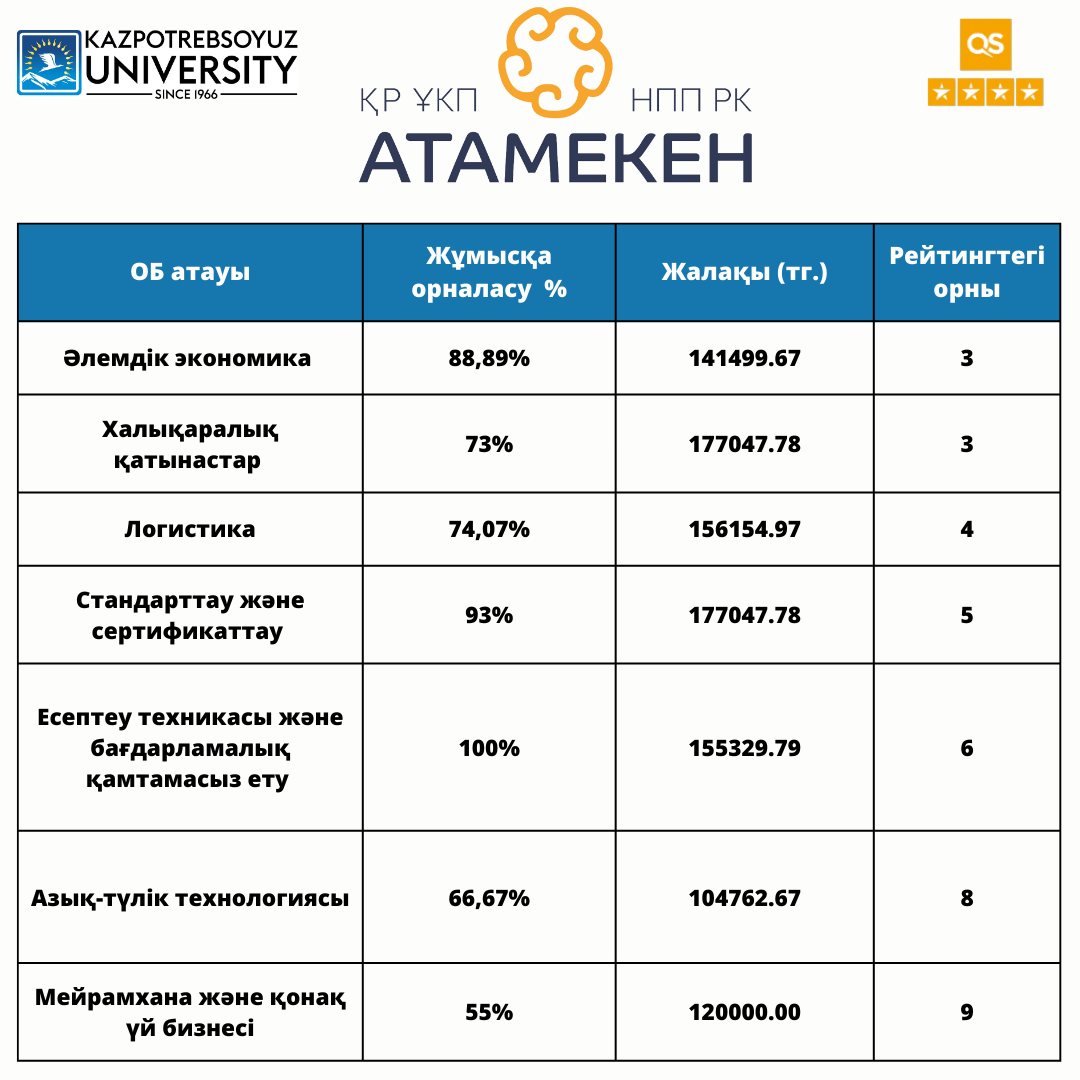 Рейтингке қатысқан университет бағдарламалары бойынша жұмысқа орналасу 66%-дан 100%-ға дейін, осы бағдарламалардың түлектерінің орташа жалақысы орта есеппен 134.825 теңгені, ал жұмыс іздеу уақыты 1,5 айдан 4 айға дейін.
