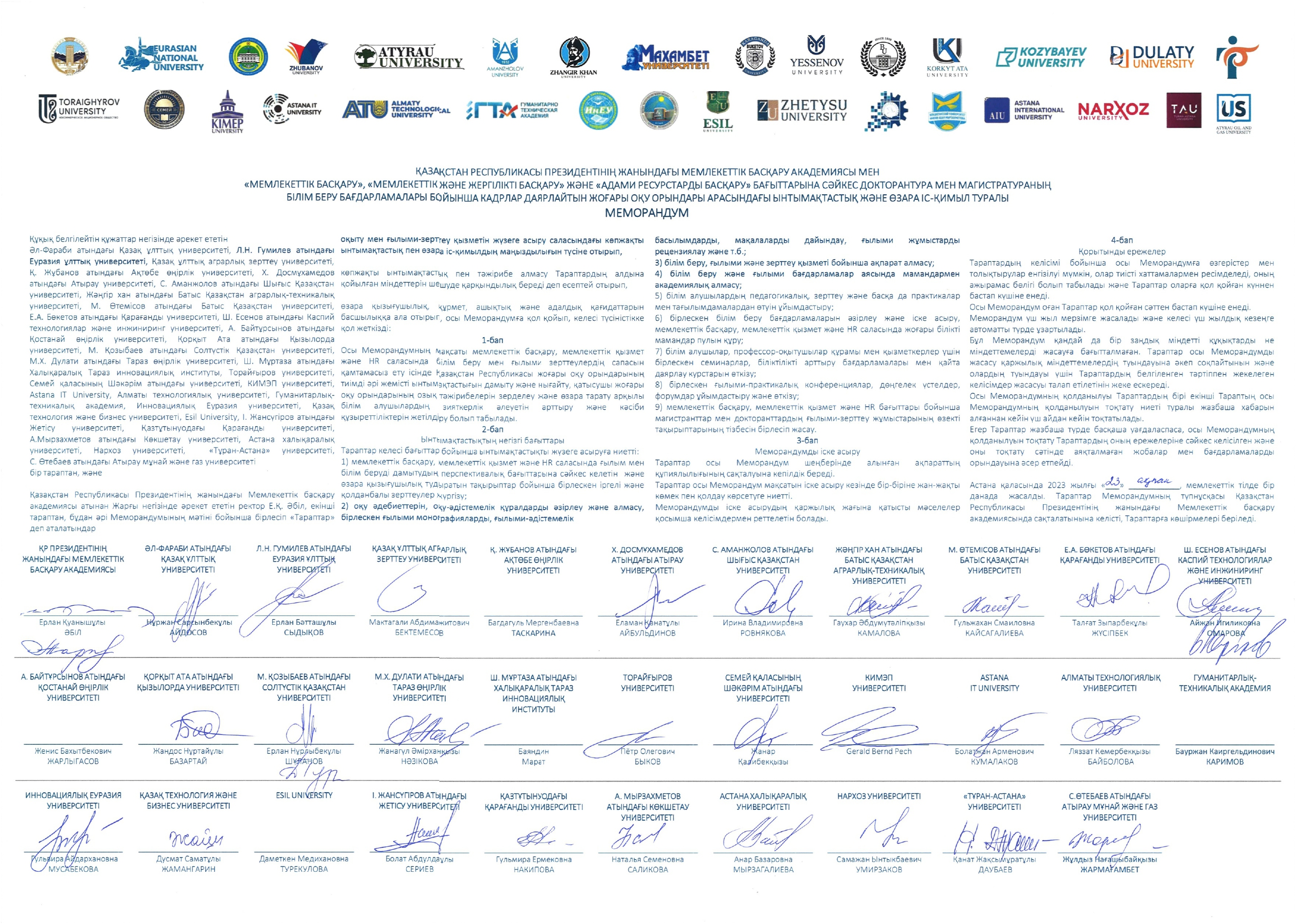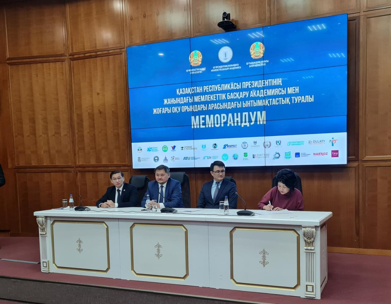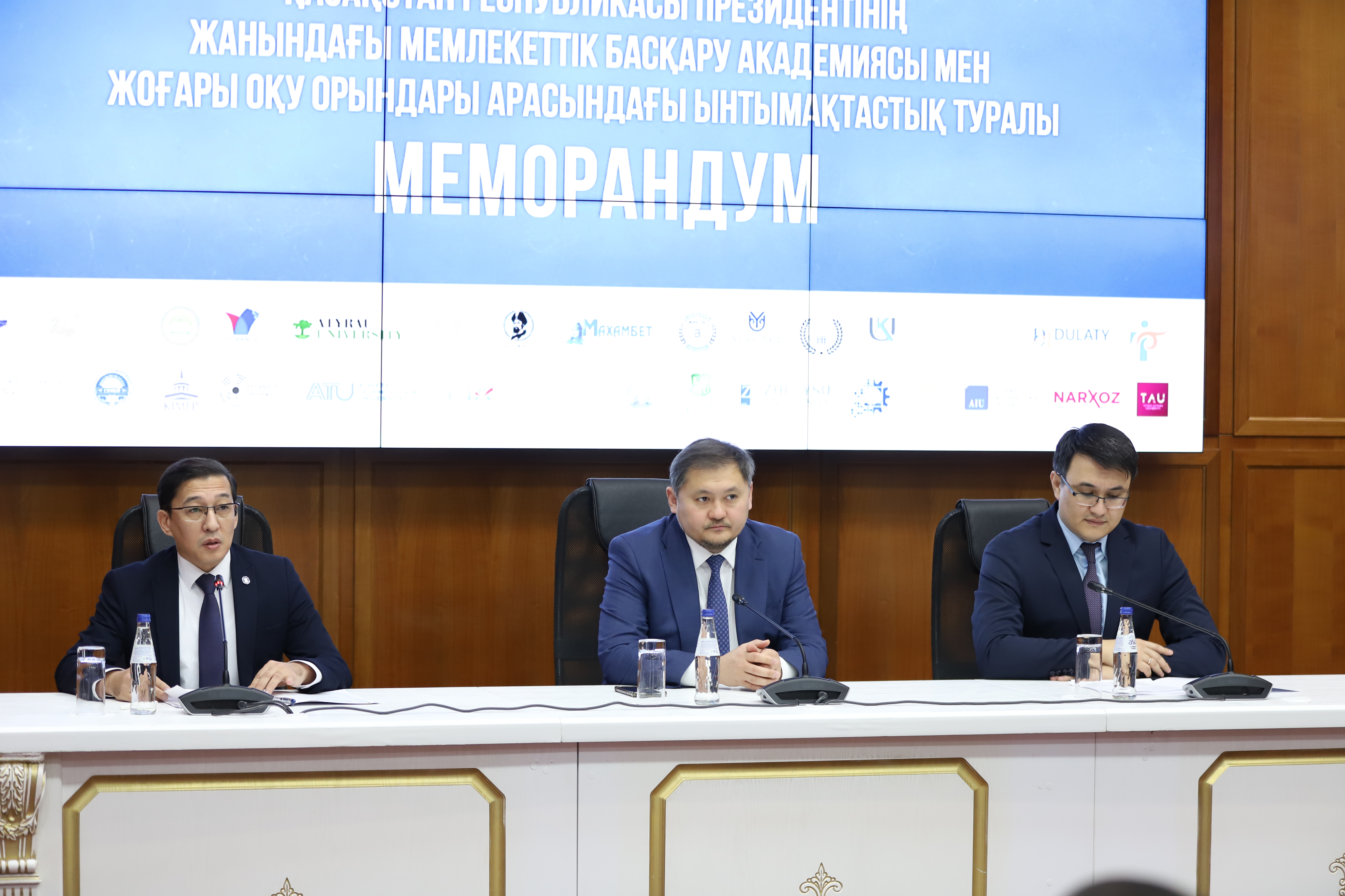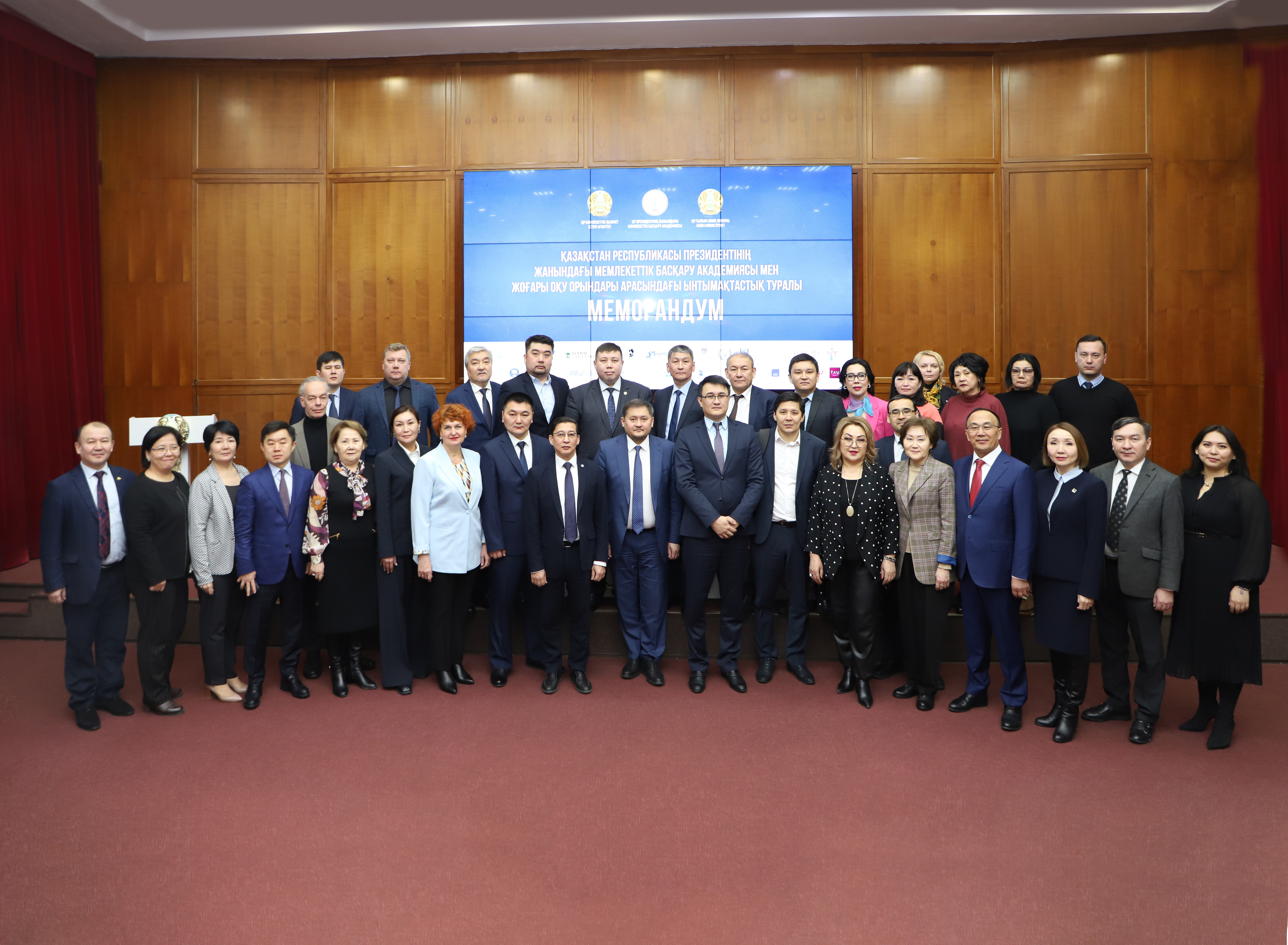 2023 жылғы 24 ақпанда Қазақстан Республикасы Президентінің жанындағы Мемлекеттік басқару академиясында «Мемлекеттік басқару», «Мемлекеттік және жергілікті басқару», «Адамзат ресурстарын басқару» мамандықтары бойынша докторантура мен бакалавриат дайындайтын қазақстандық жоғары оқу орындарымен ынтымақтастық туралы меморандумға қол қою рәсімі өтті.