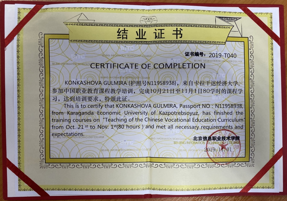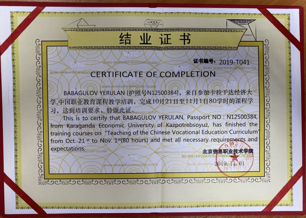 Қазтұтынуодағы Қарағанды экономикалық университетінің экономика, бизнес және құқық колледжінің оқытушылары үшін Бейжің ақпараттық технологиялар колледжінде қысқа мерзімді тағылымдама (Пекин қ,, Қытай)