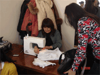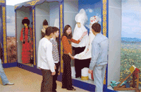 | Экскурсия жүргізушінің Оңтүстік Қазақстан әйелдерінің сұламасы туралы әңгімесі | Экскурсия жүргізуші мұражайға келушілерге сәукелеге тігілетін шашақпен таныстыруда |