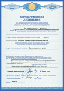По итогам Государственной аттестации на основании рекомендаций Республиканского Совета по лицензированию, аттестации и аккредитации учебных заведений институту разрешено право на ведение образовательной деятельности согласно приказа Министра Образования Республики Казахстан №133 от 19 июня 1995 года “О выдачи лицензии на право ведения образовательной деятельности государственным высшим и средним специальным учебным заведениям”.