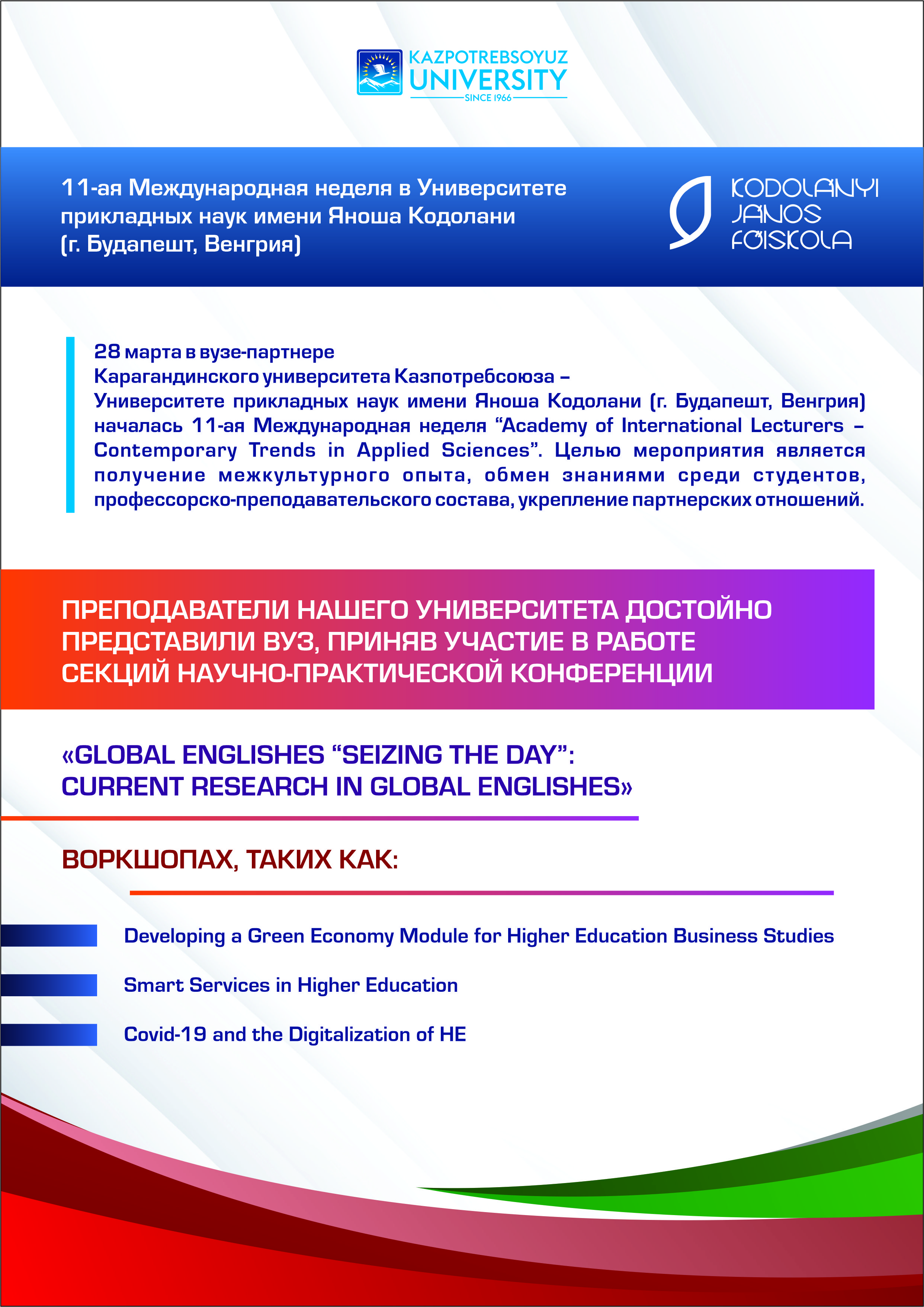 28 марта в вузе - партнере Карагандинского университета Казпотребсоюза – Университете прикладных наук имени Яноша Кодолани (г. Будапешт, Венгрия) началась 11-ая Международная неделя “Academy of International Lecturers – Contemporary Trends in Applied Sciences”. Целью мероприятия является получение межкультурного опыта, обмен знаниями среди студентов, профессорско-преподавательского состава, укрепление партнерских отношений.