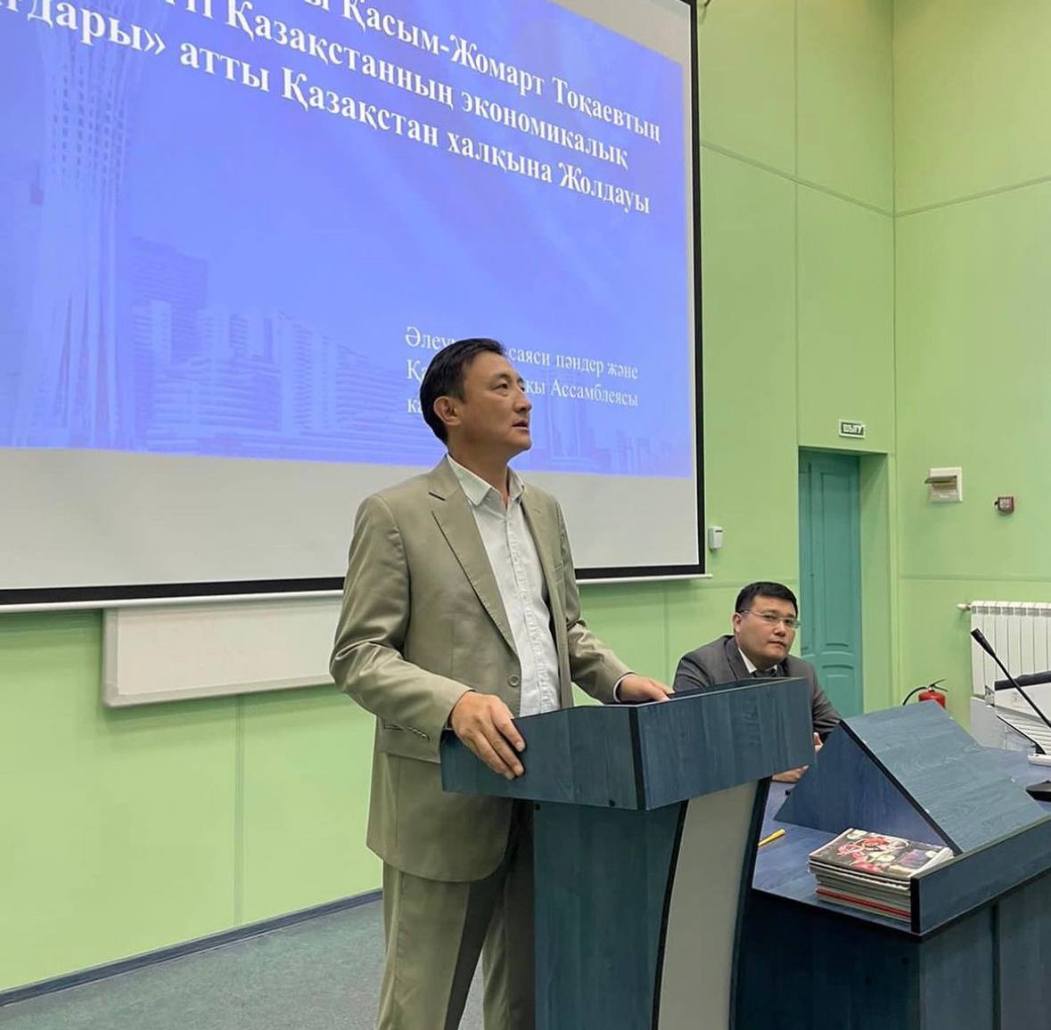 Они встретились со студентами университета для обсуждения и разъяснения Послания Президента Касым-Жомарта Токаева «Экономический курс Справедливого Казахстана» (1 сентября , 2023 год)