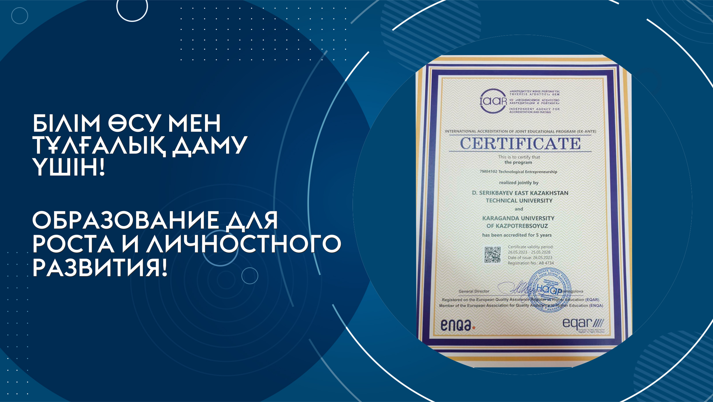 25 мая 2023 года НУ «Национальным Агентством аккредитации и рейтинга» (регистрационный номер №АВ4734) успешно аккредитована совместная образовательная программа магистратуры «Технологическое предпринимательство», разработанная и реализуемая двумя казахстанскими ВУЗами - Карагандинским университетом Казпотребсоюза и Восточно-Казахстанским техническим университетом имени Д. Серикбаева.