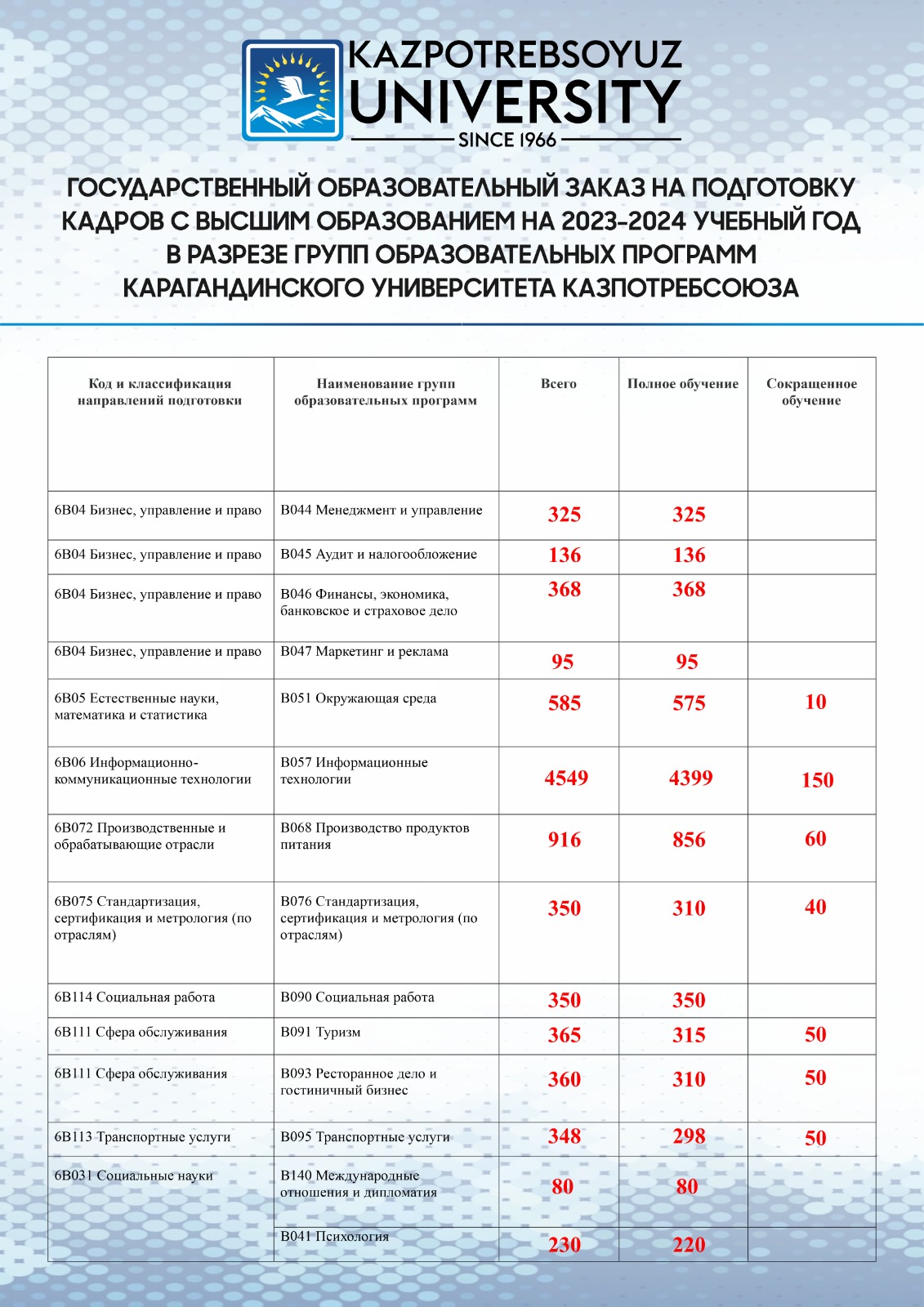 В этом году КарУ Казпотребсоюза закончили 1607 человек по 43 образовательным программам высшего и послевузовского образования. 81 выпускник получит диплом с отличием. 72% наших выпускников уже трудоустроены, 7% планируют продолжить обучение в магистратуре и докторантуре.