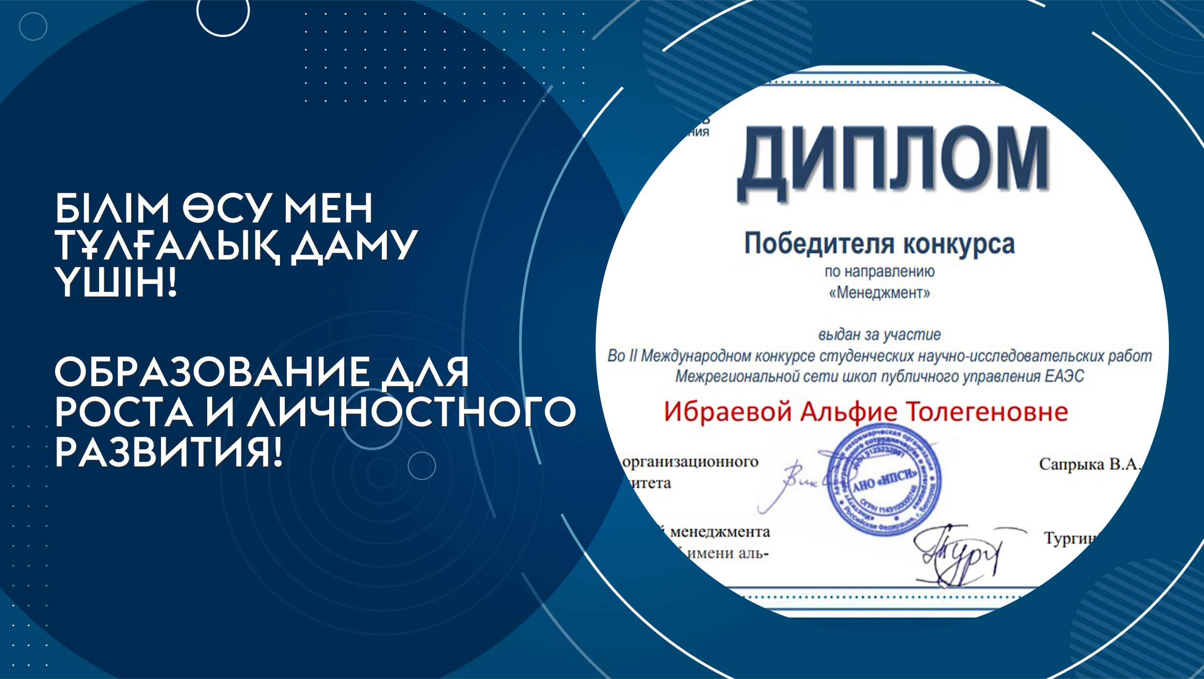 Поздравляем победителя по направлению "Менеджмент" II Международного конкурса студенческих научно-исследовательских работ Межрегиональной сети школ публичного управления ЕАЭС Ибраеву Альфию Толегеновну под научным руководством к.э.н., профессора кафедры «Менеджмент и инновации» Легостаевой Анны Анатольевной.